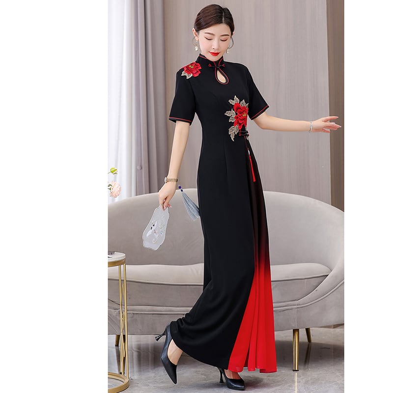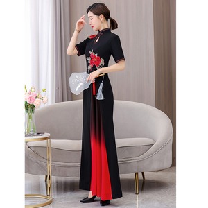 【MINZUFENGシリーズ】★チャイナ風ワンピース★ 5color 改良型チャイナドレス アオザイ フェイクレイヤード 半袖 気質アップ 演出服装
