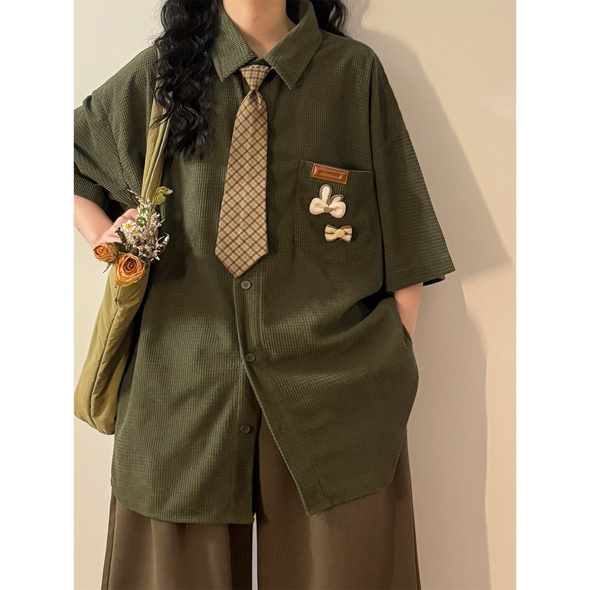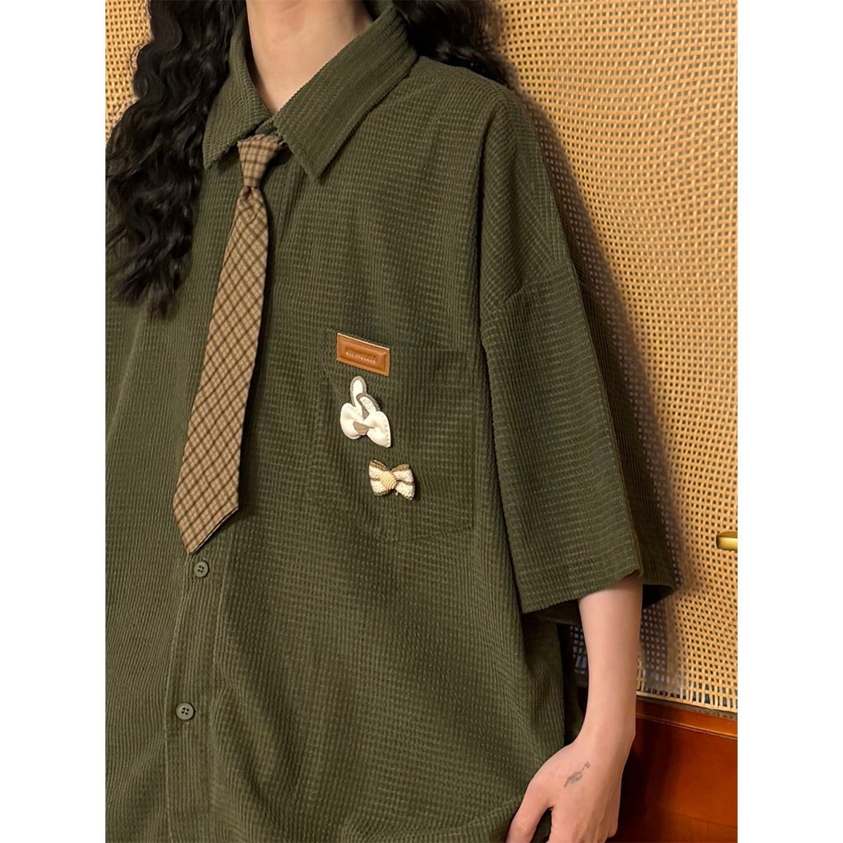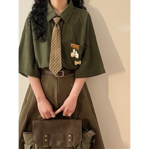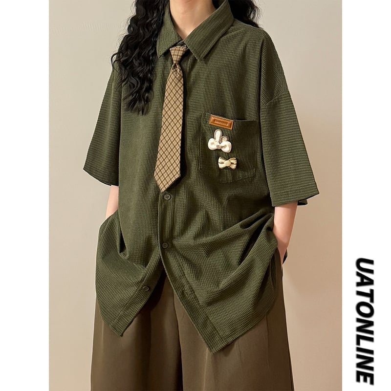 【UATONLINEシリーズ】★シャツ★ ネクタイ付き トップス ワッフル生地 男女兼用 メンズ カジュアル 半袖シャツ 緑