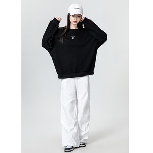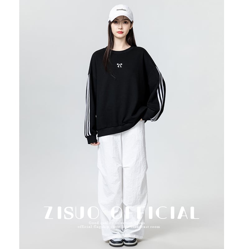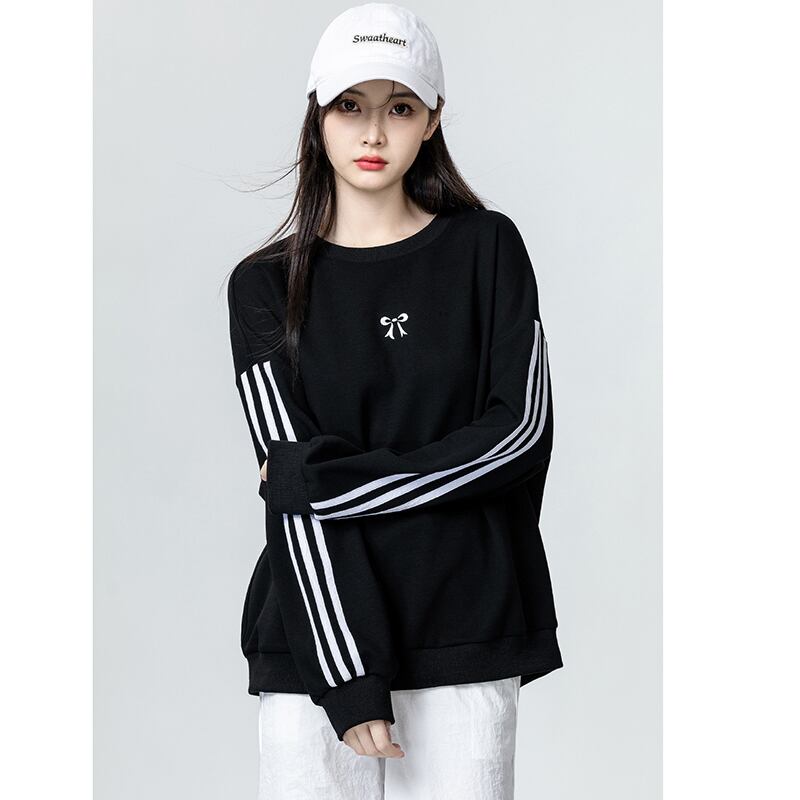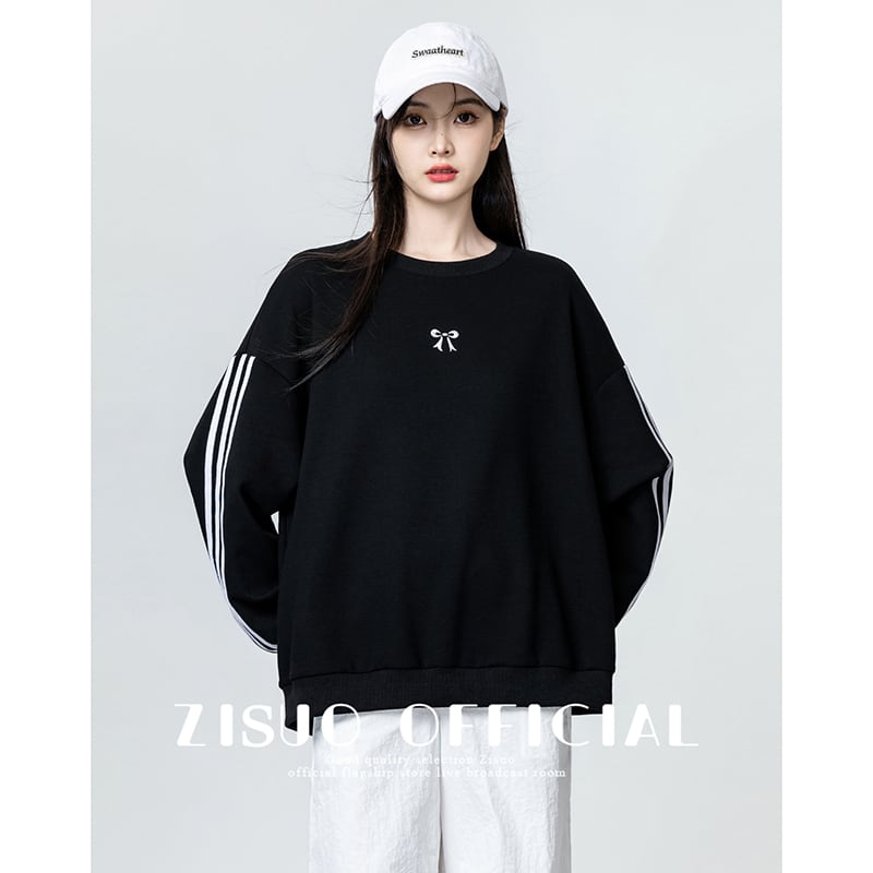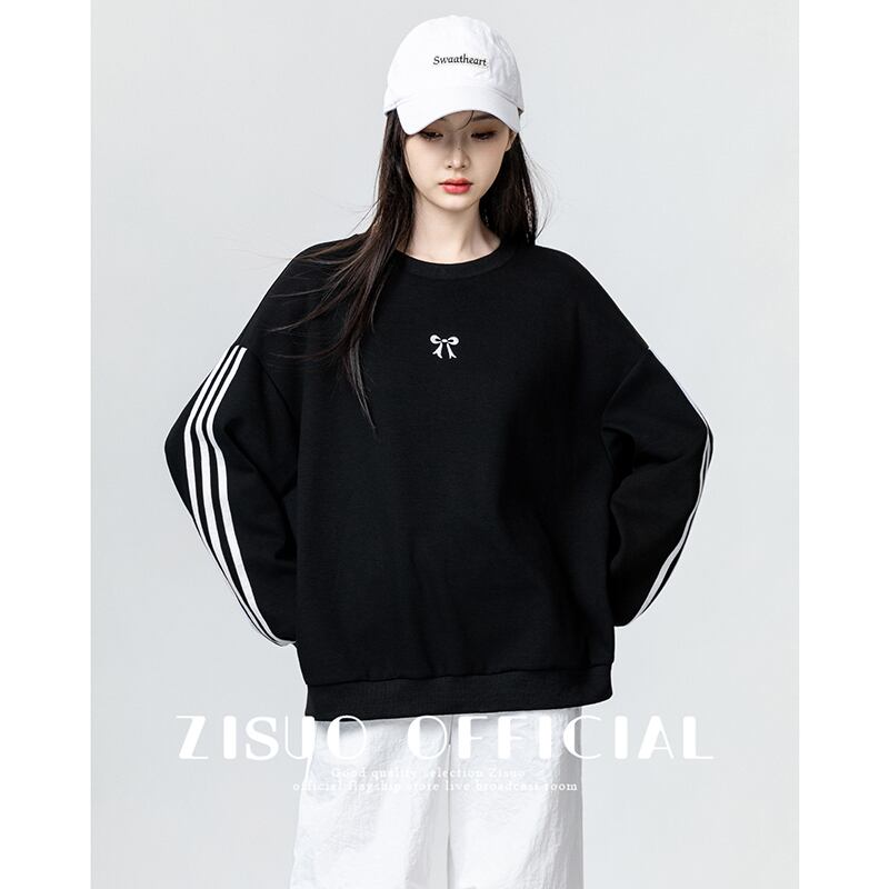 【ZISUOシリーズ】★トップス★ スウェット 長袖 レディース 縦縞 縞模様 ブラック 黒い ラウンドネック