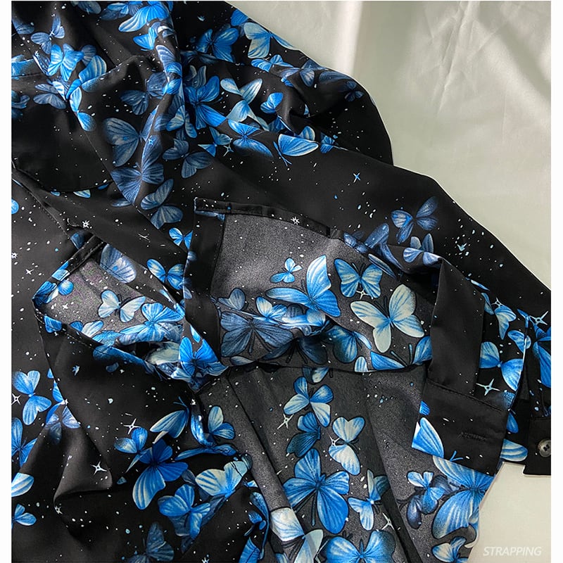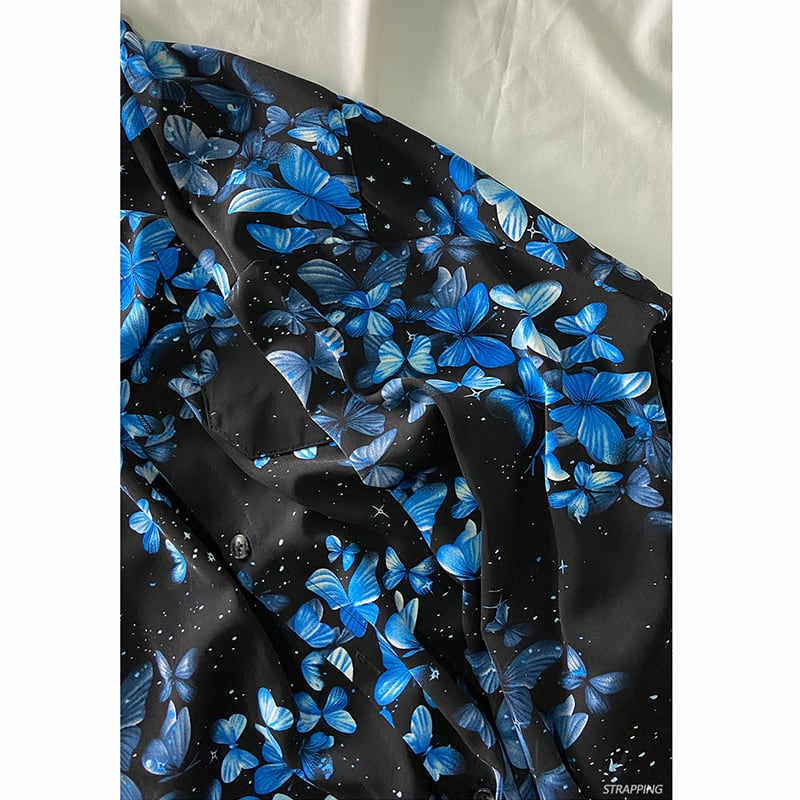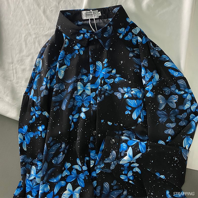 【STRAPPINGシリーズ】★シャツ★ トップス 長袖シャツ 男女兼用 メンズ 花柄 ブルー 青い ブラック 黒い