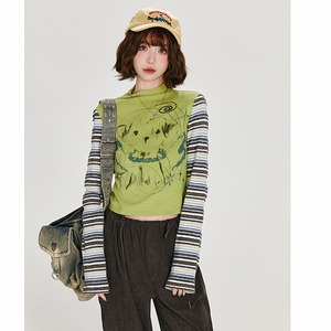 【Girlyhaloシリーズ】★Tシャツ★ トップス 長袖 レディース 切り替え 横縞 縞模様 カートゥーン グリーン 緑