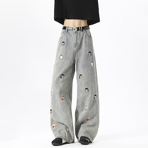 【Qotriockシリーズ】★デニムパンツ★ 刺繍 3color ボトムス カジュアルパンツ 男女兼用 メンズ 犬 カートゥーン