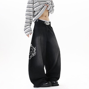 【GraceRubシリーズ】★デニムパンツ★ ボトムス ズボン 男女兼用 メンズ デザイン性有り レトロ 黒 ブラック