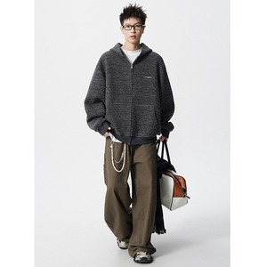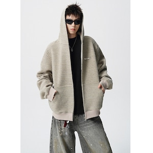 【OUDELUシリーズ】★アウター★ 2color ジャケット ジップパーカー 男女兼用 メンズ 横縞 縞模様 ダークグレー 帽子付き
