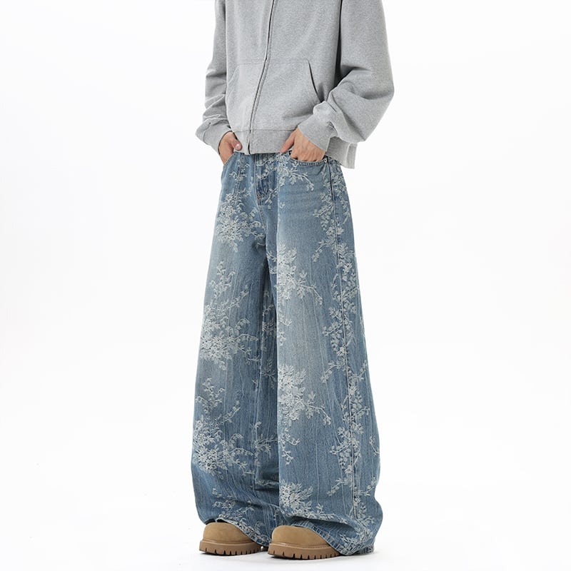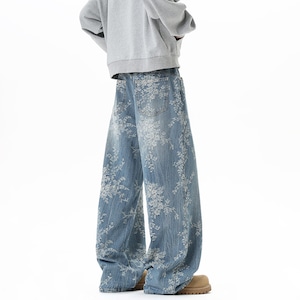 【GraceRubシリーズ】★デニムパンツ★ ボトムス ズボン 男女兼用 メンズ 花柄 ブルー 青い 合わせやすい
