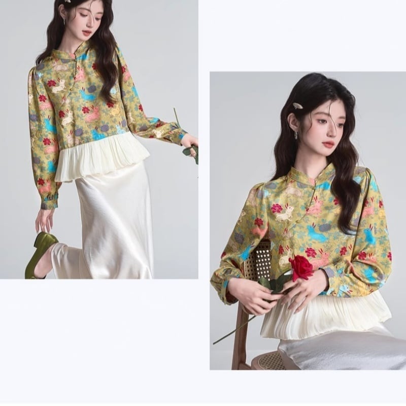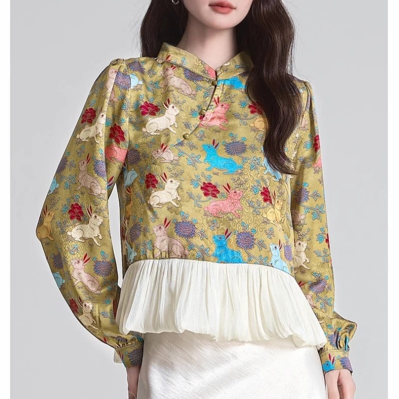 【LaXIAシリーズ】★チャイナ風トップス★ チャイナボタン ウサギ 兎 刺繍 レディース うさぎ 着痩せ 気質アップ