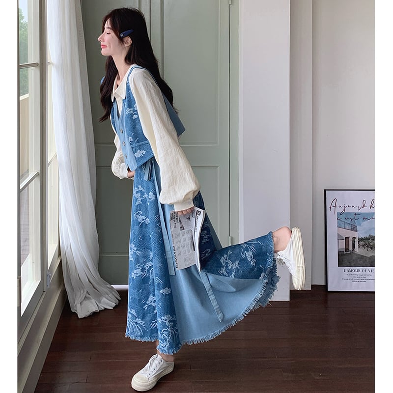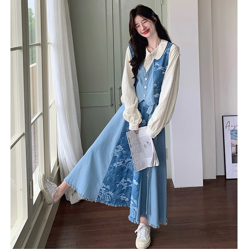 【KAKAシリーズ】★チャイナ風セットアップ★ 3点セット シャツ+スカート+ベスト デニム カジュアル