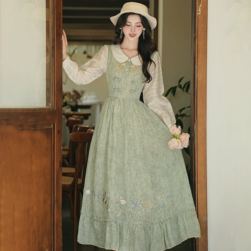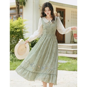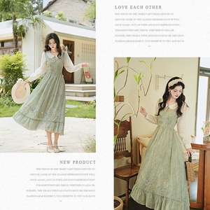 【Culture of loveシリーズ】★チャイナ風ワンピース★ 長袖 レディース 可愛い 切り替え 通勤 デート グリーン 緑 リボン