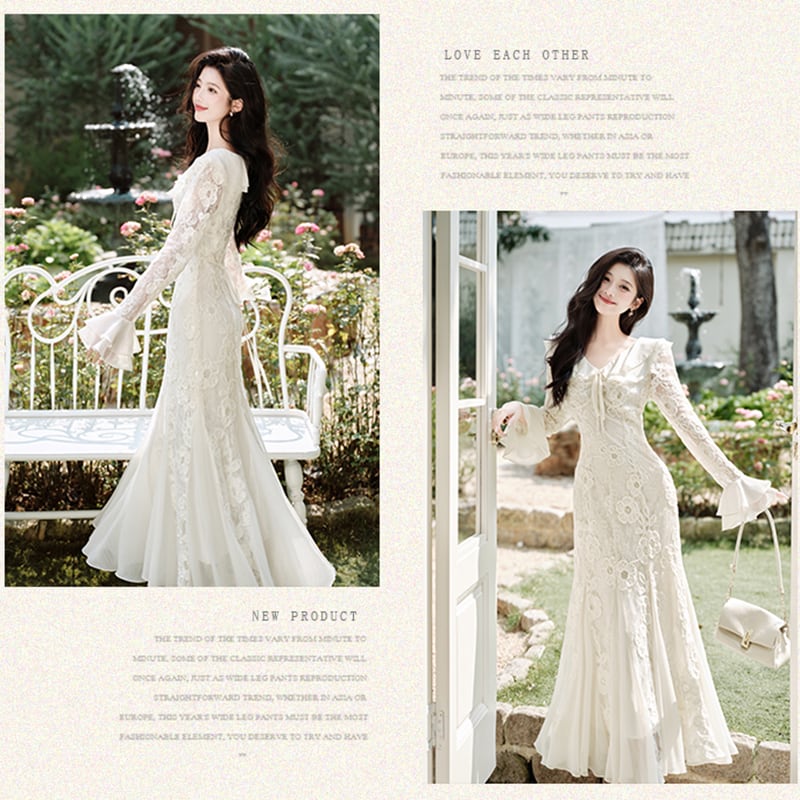 【SIANMIシリーズ】★チャイナ風ワンピース★ マーメイドドレス Vネック レース 長袖 レディース レトロ