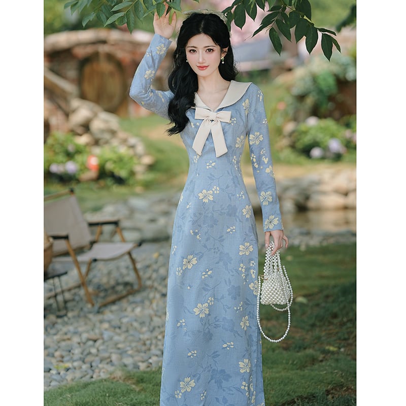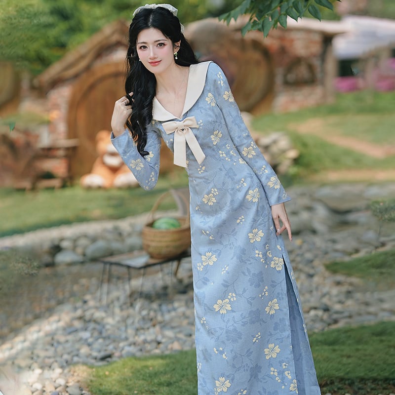 【清芷依緣シリーズ】★ワンピース★ リボン 花柄 長袖 レディース ロング丈 ブルー 青い 着痩せ スリム