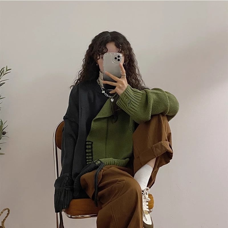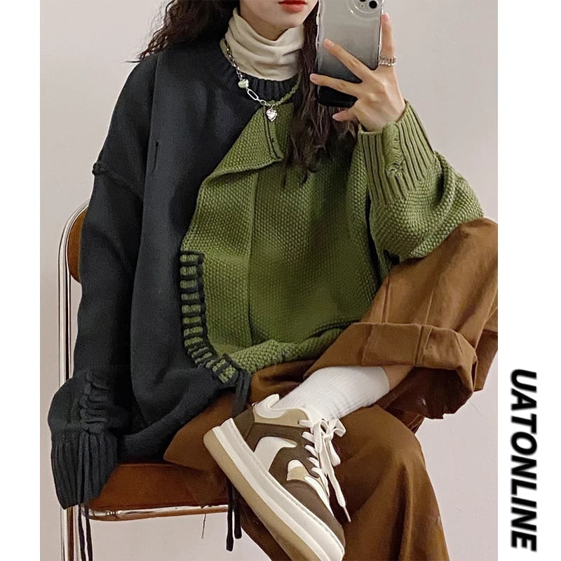【UATONLINEシリーズ】★セーター★ ニットトップス 男女兼用 メンズ レディース 配色 グリーン 緑