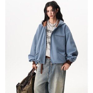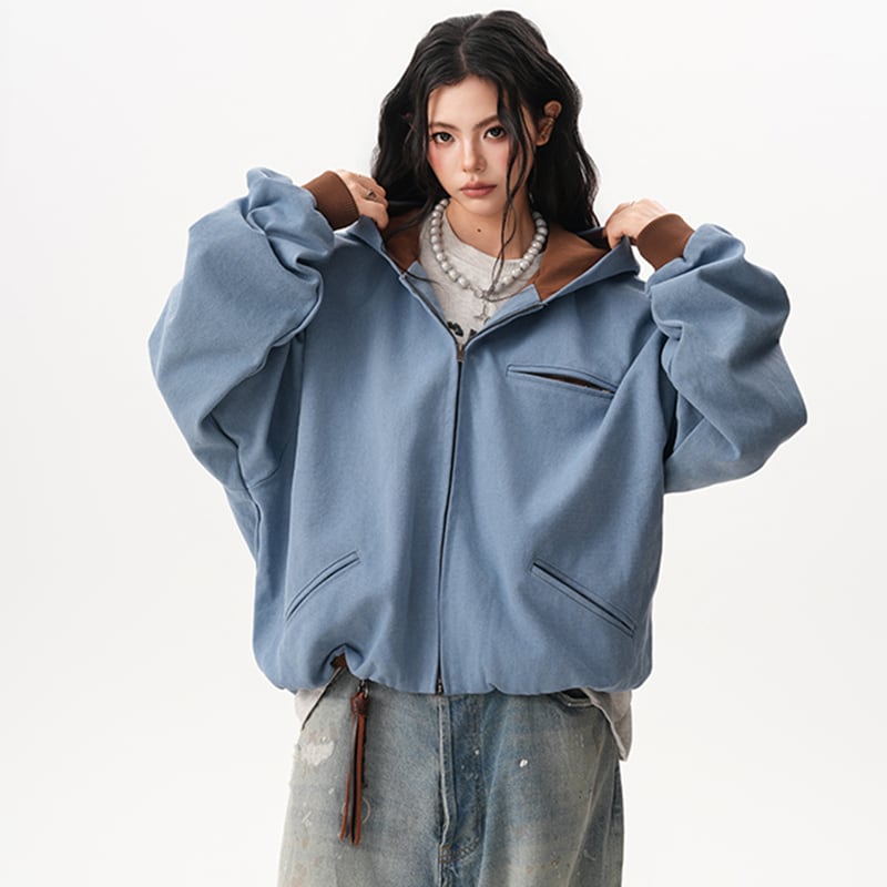 【Bwkaシリーズ】★ジャケット★ 2color アウター 男女兼用 メンズ 配色 帽子付き ショート丈 切り替え 黒 青