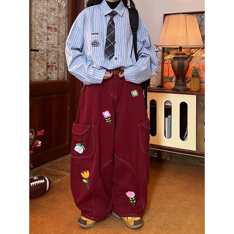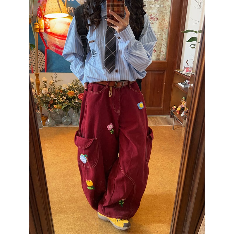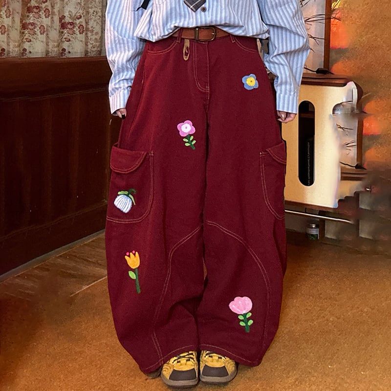 【C2 Studiosシリーズ】★デニムパンツ★ 刺繍 ズボン ボトムス ガウチョパンツ 花刺繍 レッド 赤い