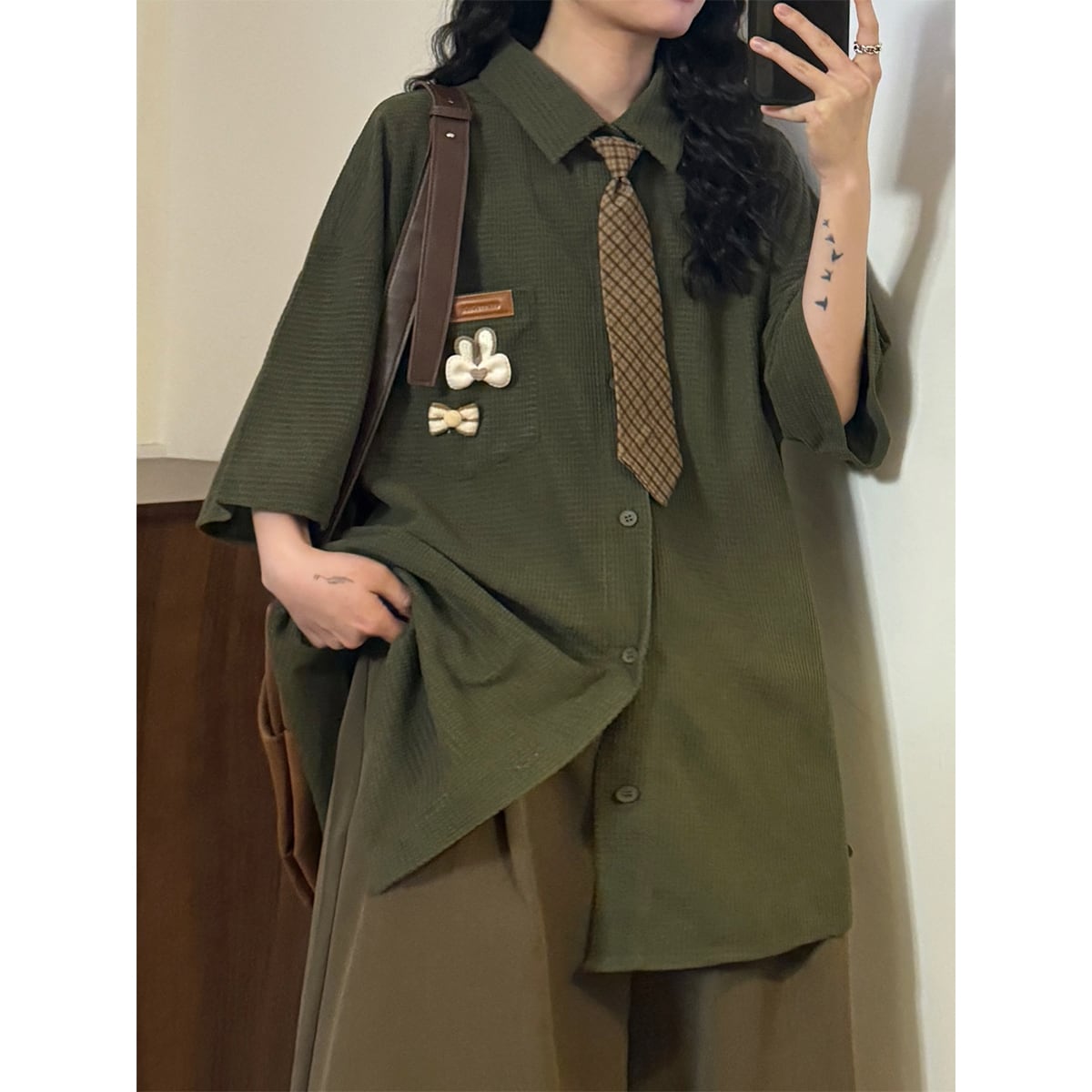【UATONLINEシリーズ】★シャツ★ ネクタイ付き トップス ワッフル生地 男女兼用 メンズ カジュアル 半袖シャツ 緑