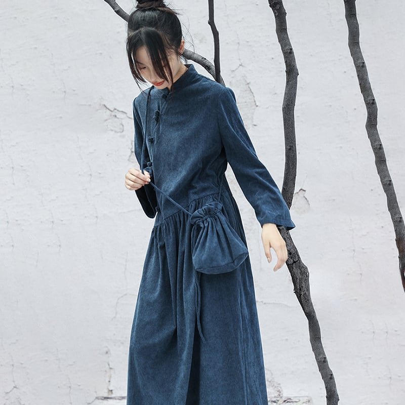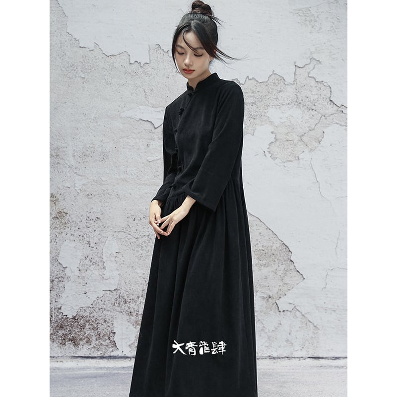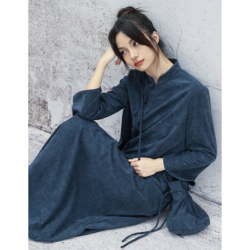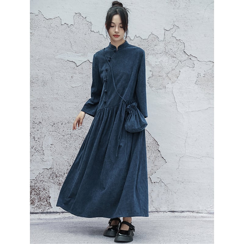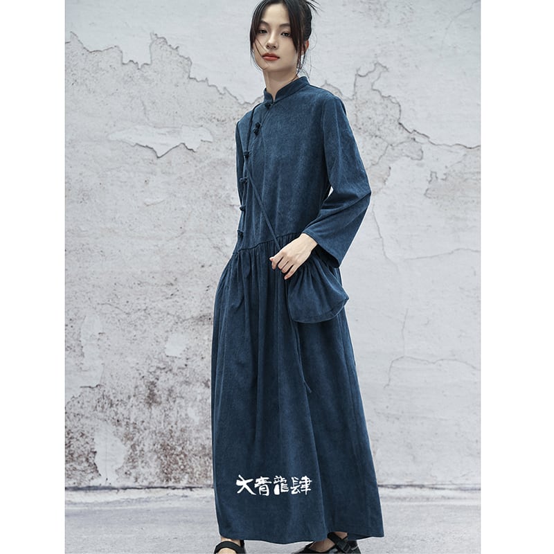 【大青龍肆シリーズ】★チャイナ風ワンピース★ 2color コーデュロイ チャイナボタン 中華服 ロング丈 ブルー ブラック 青 黒