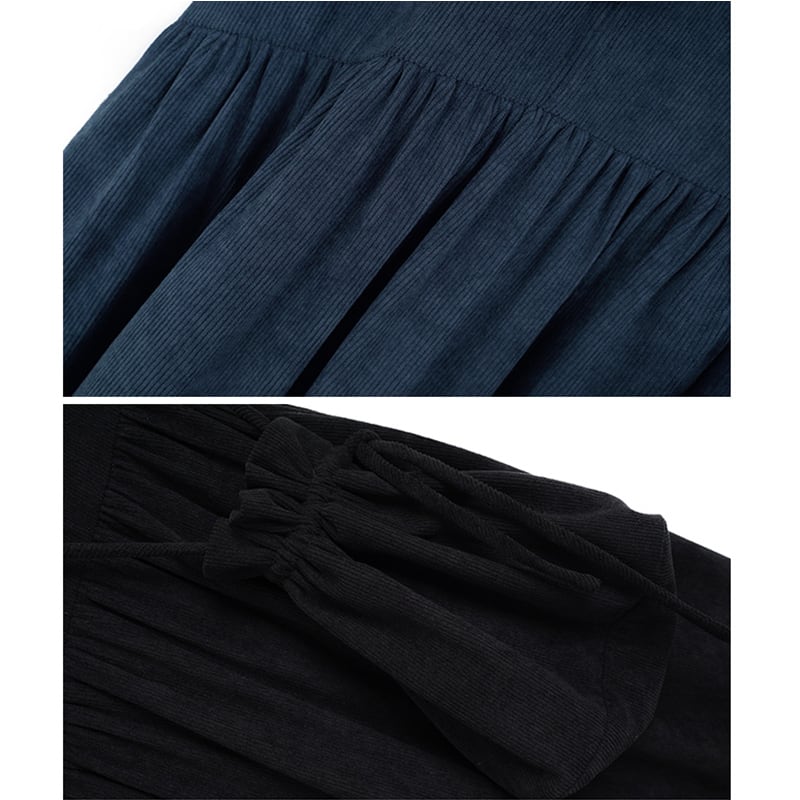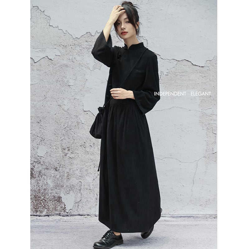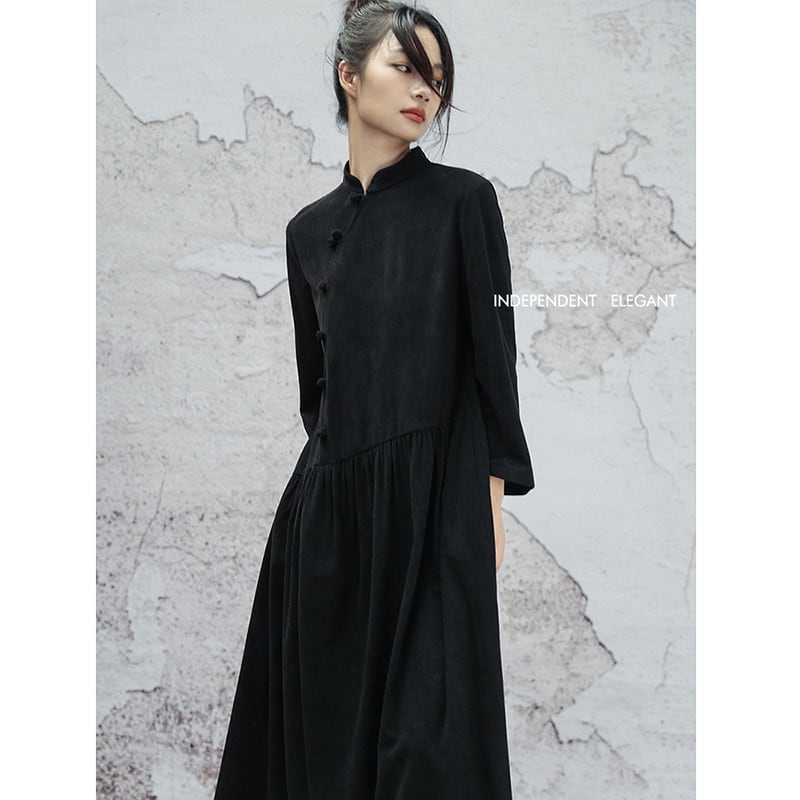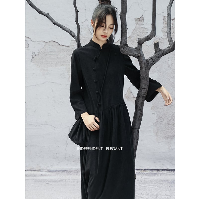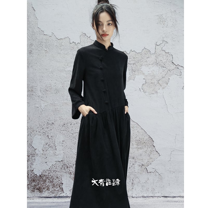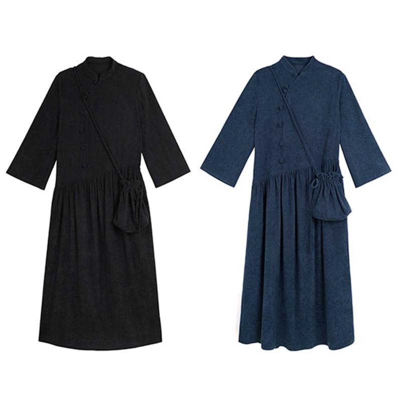 【大青龍肆シリーズ】★チャイナ風ワンピース★ 2color コーデュロイ チャイナボタン 中華服 ロング丈 ブルー ブラック 青 黒