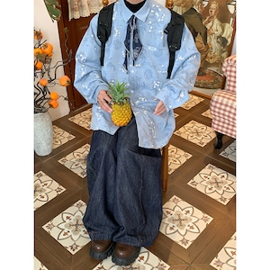 【C2 Studiosシリーズ】★チャイナ風トップス★ シャツ 長袖シャツ 花柄シャツ 男女兼用 メンズ ブルー 青い