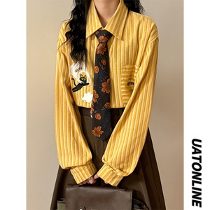 【UATONLINEシリーズ】★シャツ★ 刺繍 猫 ねこ ネコ トップス 男女兼用 メンズ おしゃれ 縦縞 横縞 縞模様 可愛い 長袖シャツ 黄
