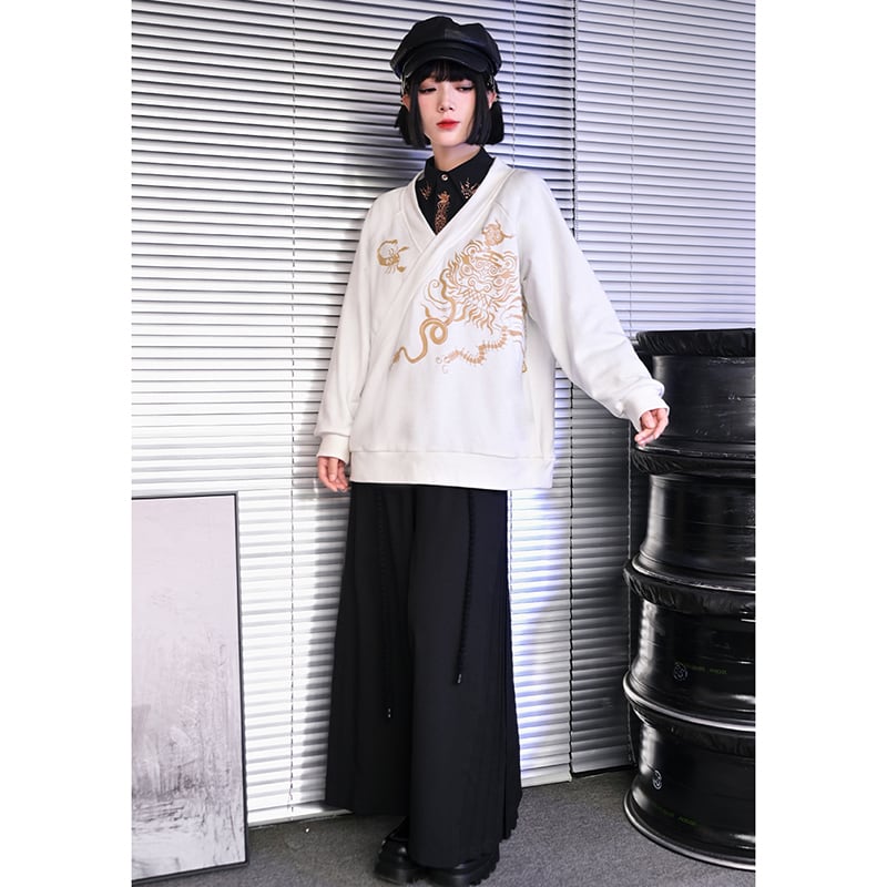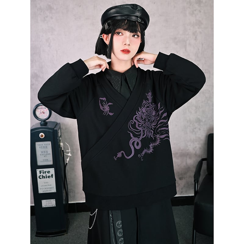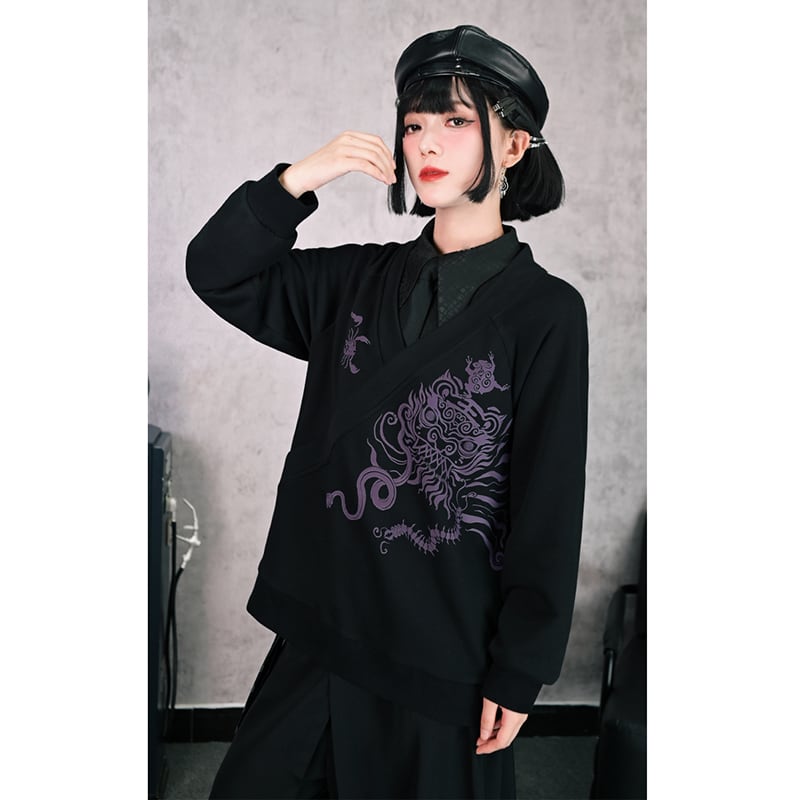 【古怪舍---五毒シリーズ】★チャイナ風トップス★ 2color Vネック プリント ブラック ホワイト 黒 白