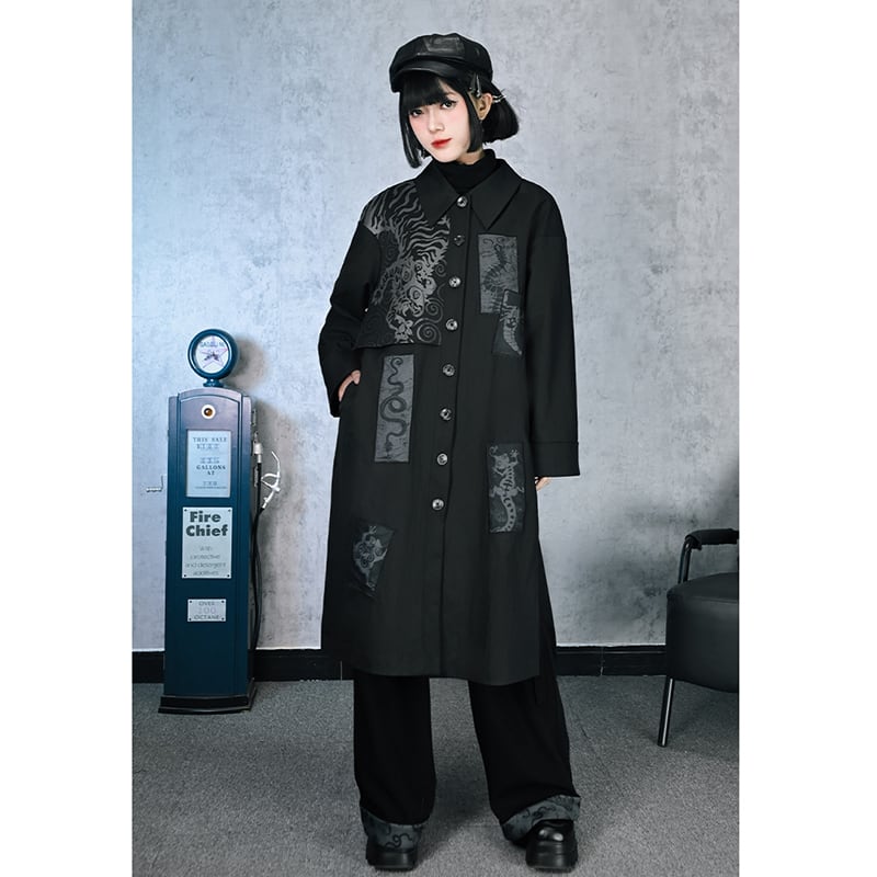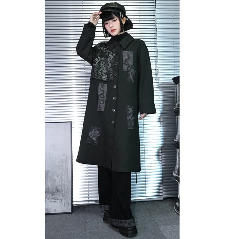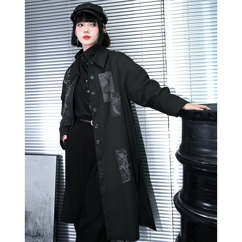【古怪舍---五毒シリーズ】★チャイナ風コート★ トレンチコート ロングコート 個性的 ブラック 黒