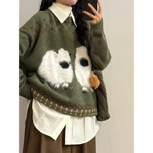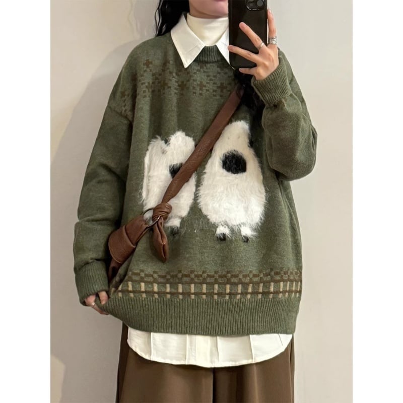 【UATONLINEシリーズ】★セーター★ ニットトップス 羊 ひつじ 動物柄 メンズ 男女兼用 レディース 合わせやすい 緑