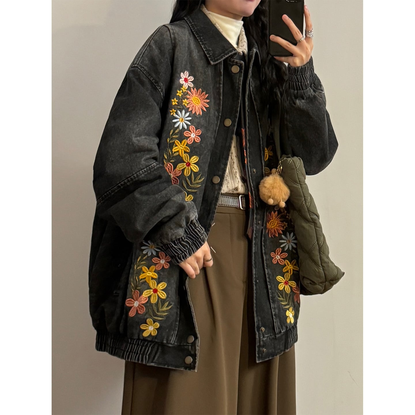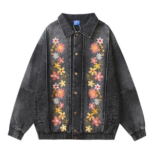 【UATONLINEシリーズ】★ジャケット★ アウター デニム 刺繍 花柄 メンズ 男女兼用 メンズ レディース レトロ ブラック 黒