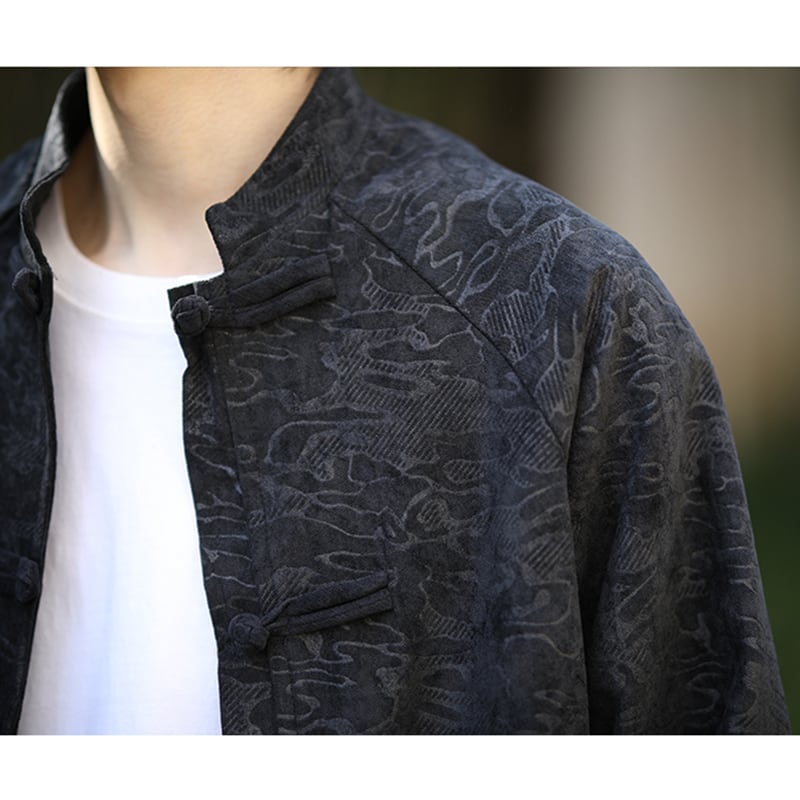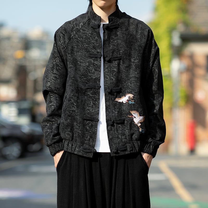 【WUSHEシリーズ】★チャイナ風アウター★ ジャケット 男女兼用 メンズ 大きいサイズ 鶴 ツル コーデュロイ 黒