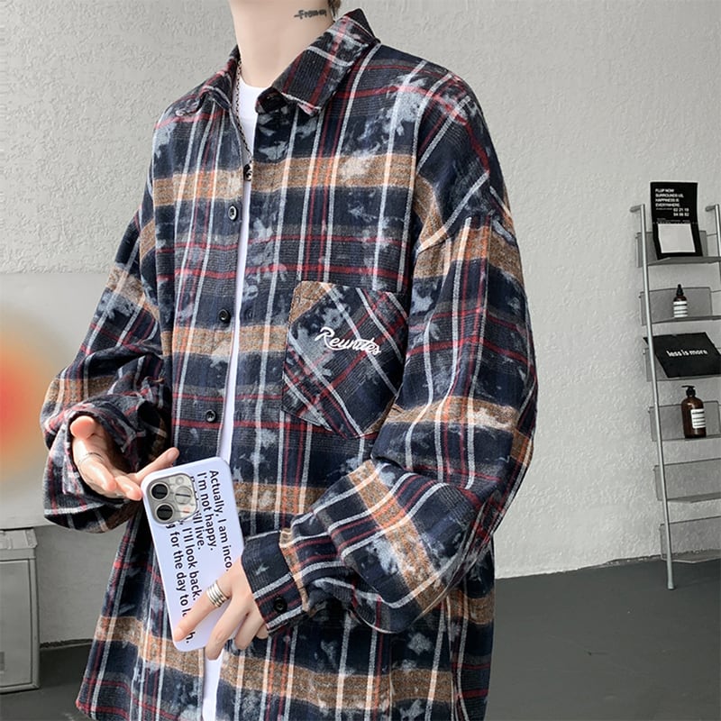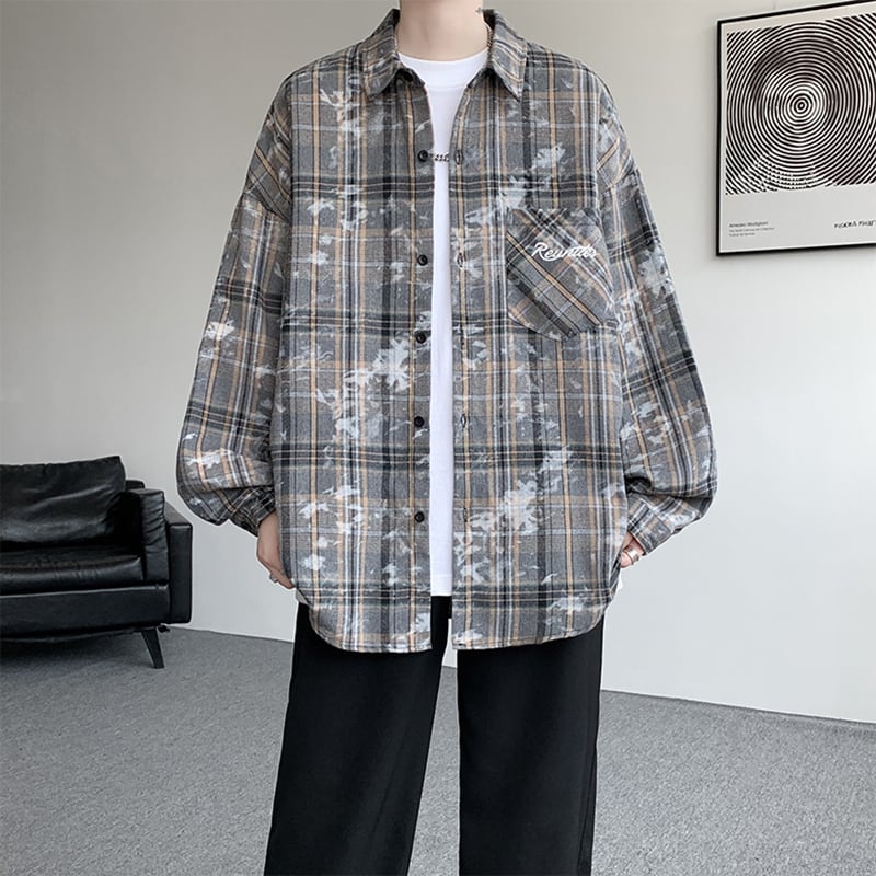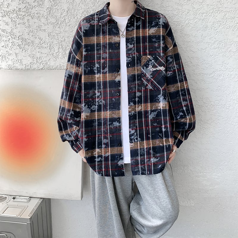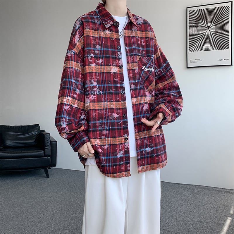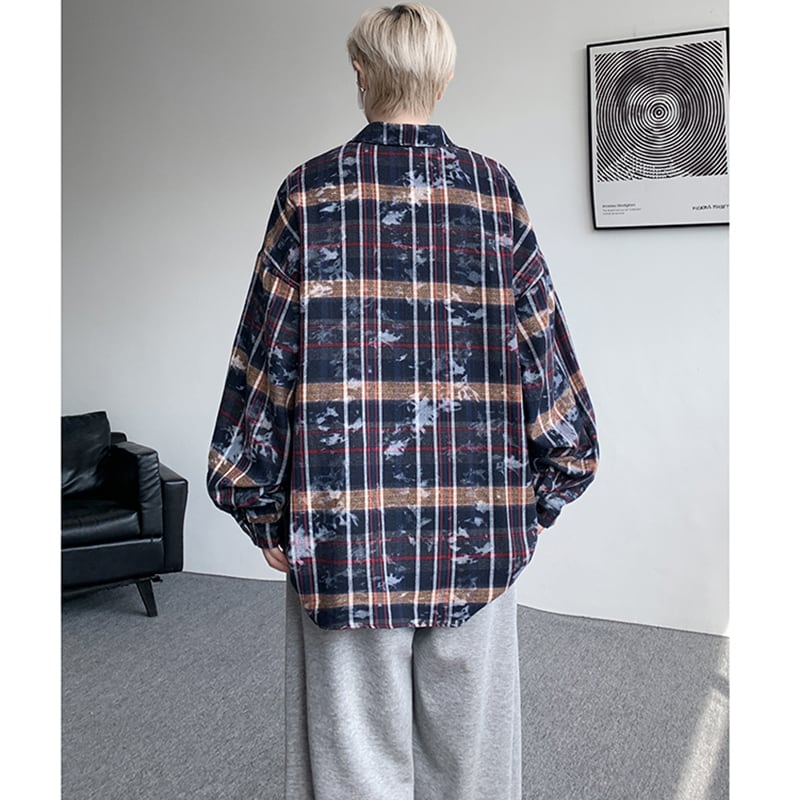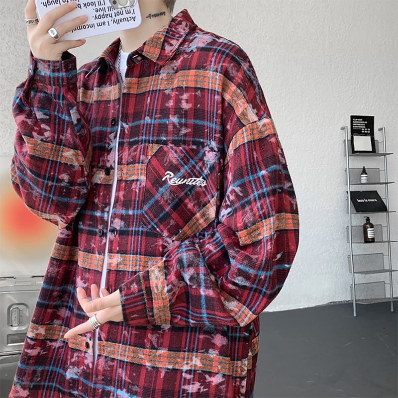 【CEXUシリーズ】★シャツ★ 3color トップス 男女兼用 メンズ 配色 おしゃれ チェック柄 赤 灰 青 レッド グレー ブルー