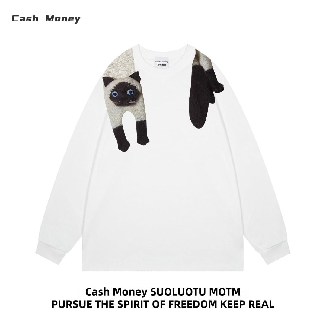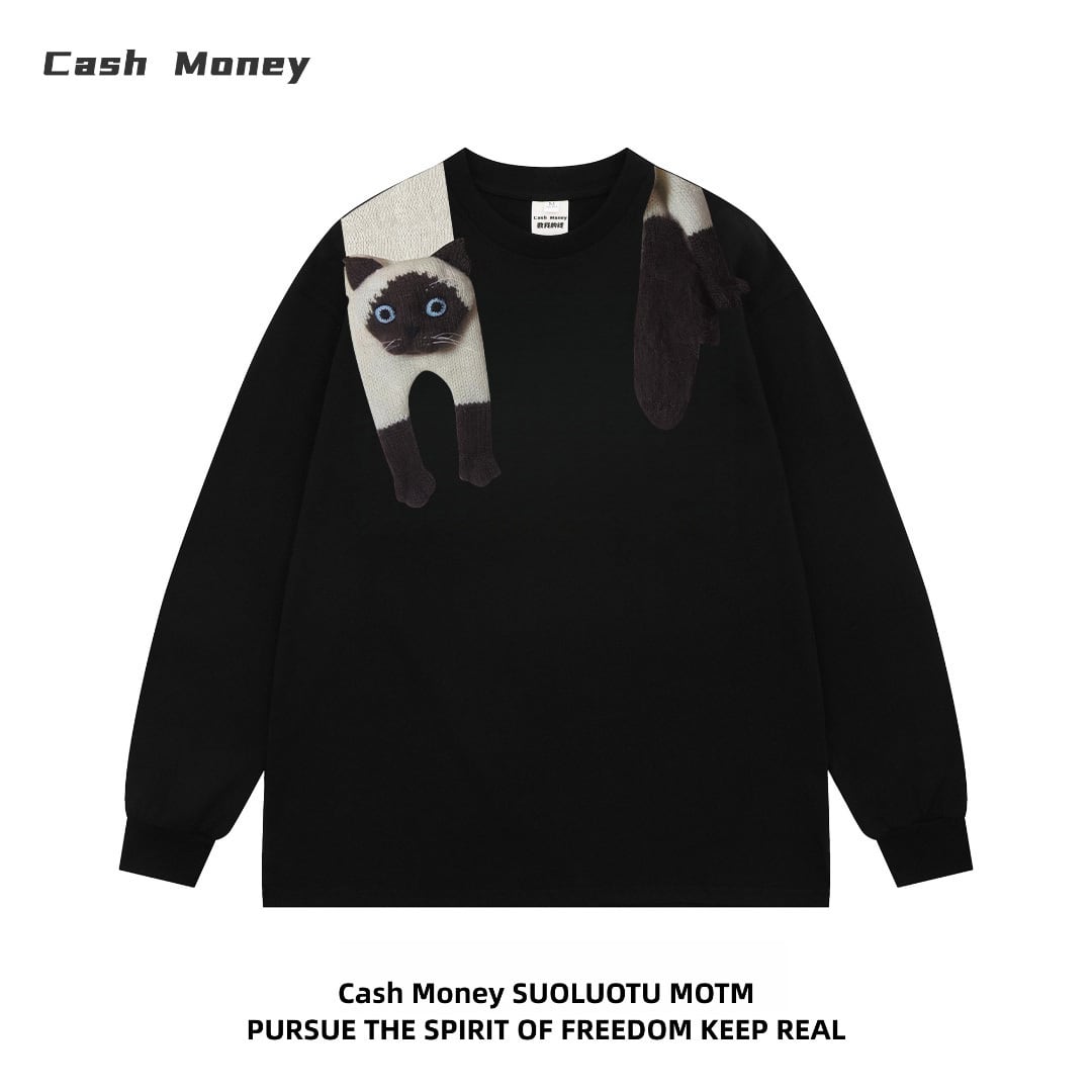 【Cash Moneyシリーズ】★トップス★ 4color スウェット 男女兼用 メンズ カートゥーン 猫 猫柄 ねこ ネコ 黒 青 灰 白