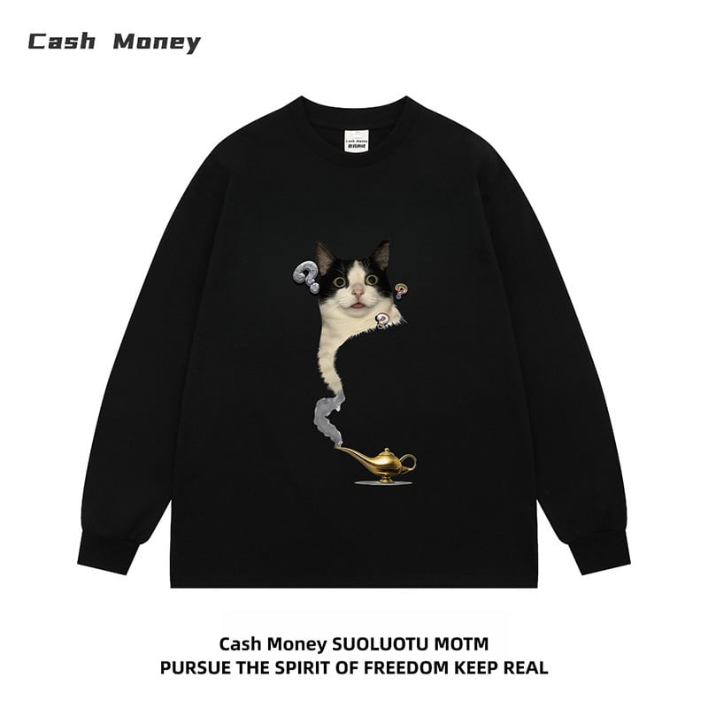 【Cash Moneyシリーズ】★トップス★ 4color スウェット 男女兼用 メンズ カートゥーン 猫 猫柄 ねこ ネコ 黒 青 灰 白