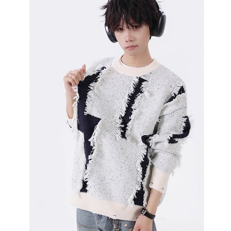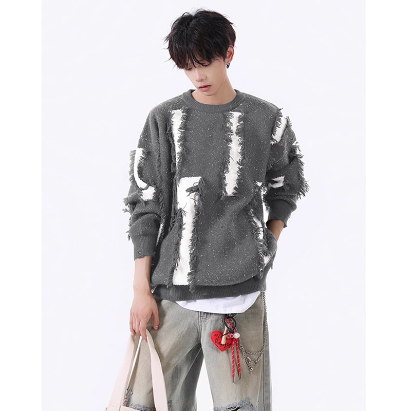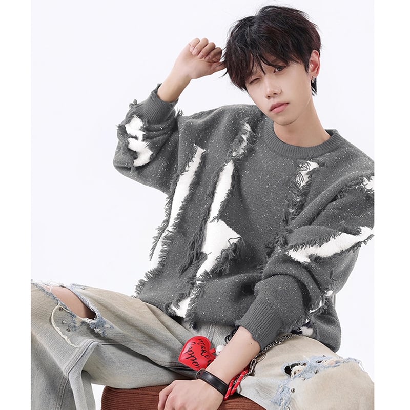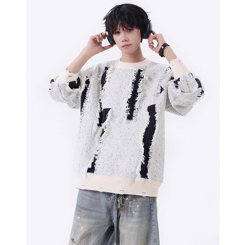 【Vesiboシリーズ】★セーター★ 4color ニットトップス 男女兼用 メンズ おしゃれ ダメージ加工 黒 青 白 灰