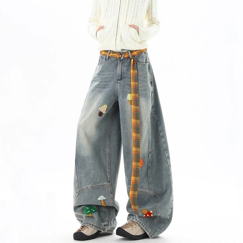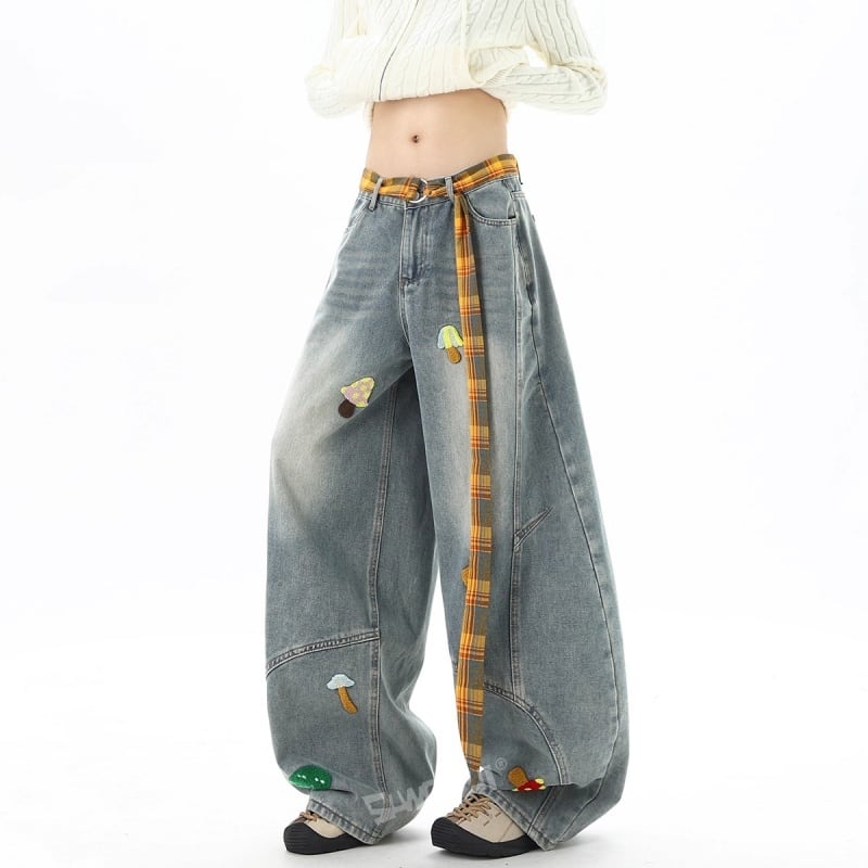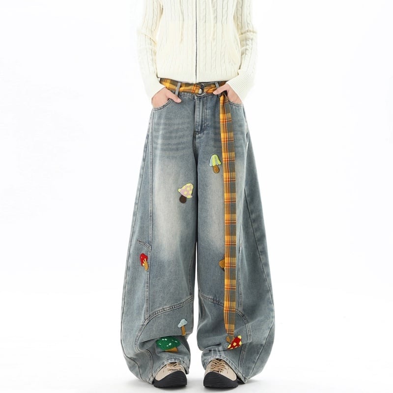 【SENSUシリーズ】★カジュアルパンツ★ デニムパンツ きのこ ズボン 男女兼用 メンズ チェック柄のベルト ブルー 青い