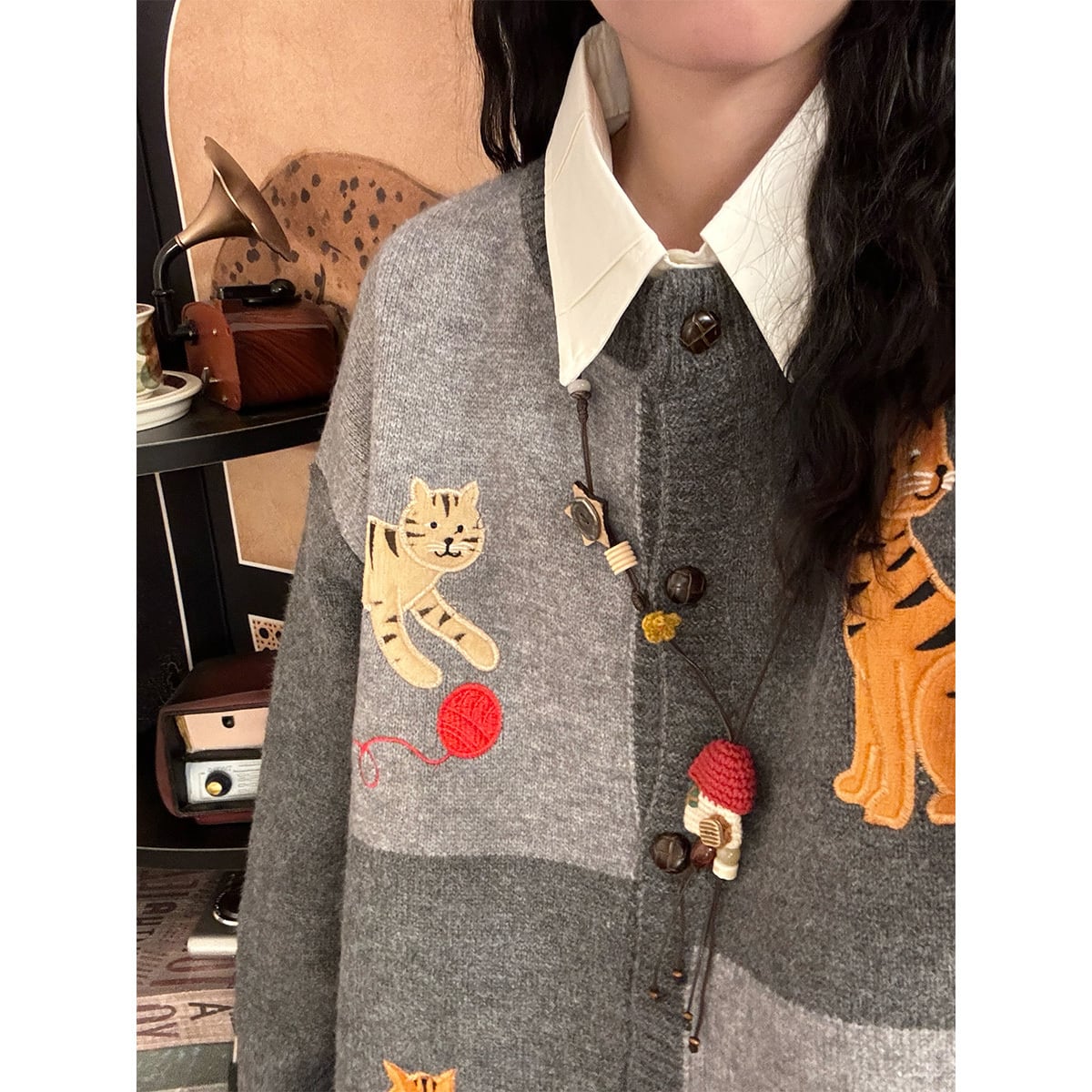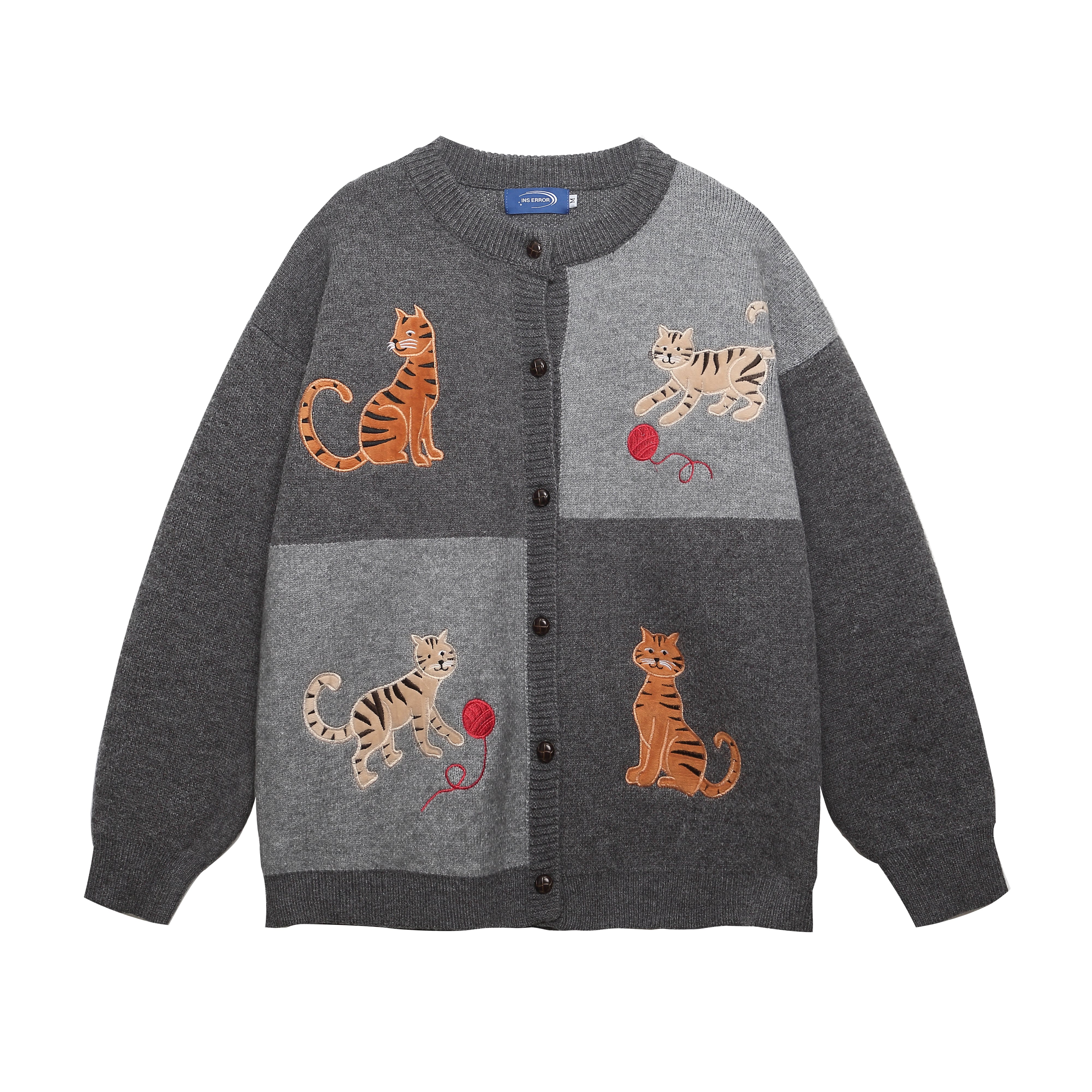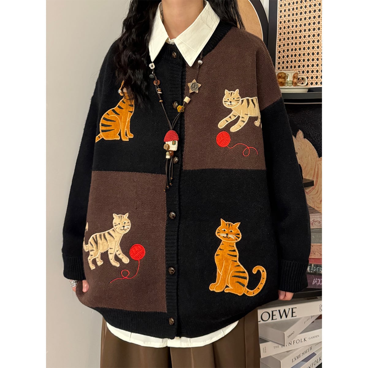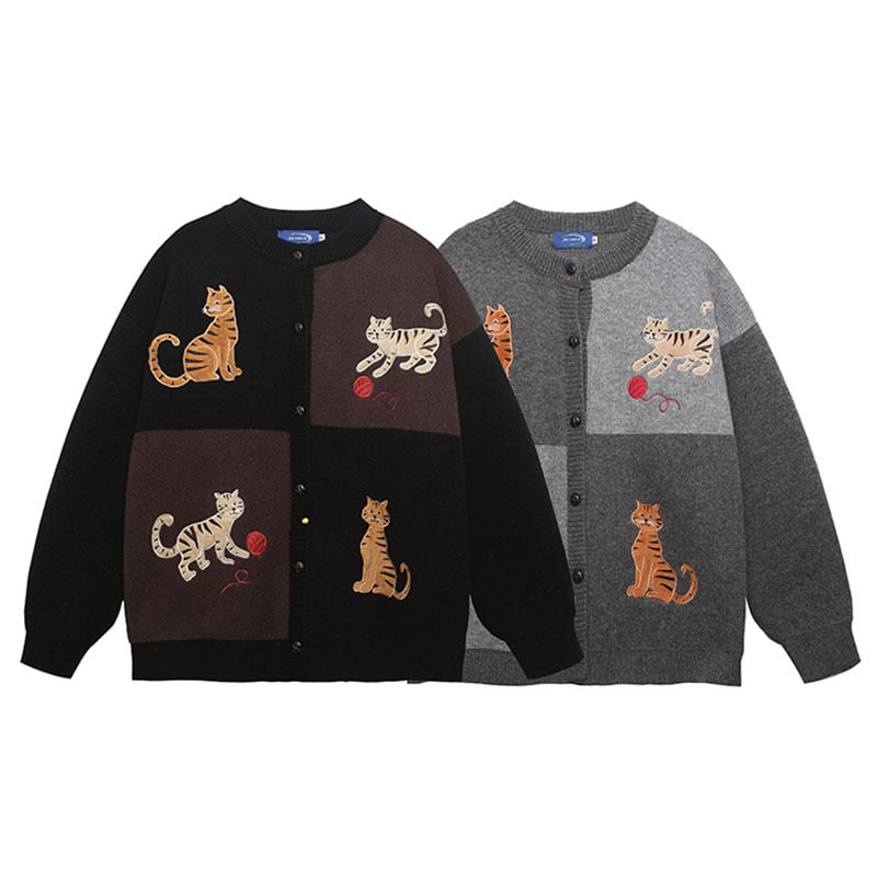 【UATONLINEシリーズ】★セーター★ 2color ニットトップス カーディガン 男女兼用 メンズ 猫 ネコ ねこ カートゥーン 黒 灰