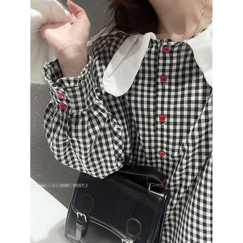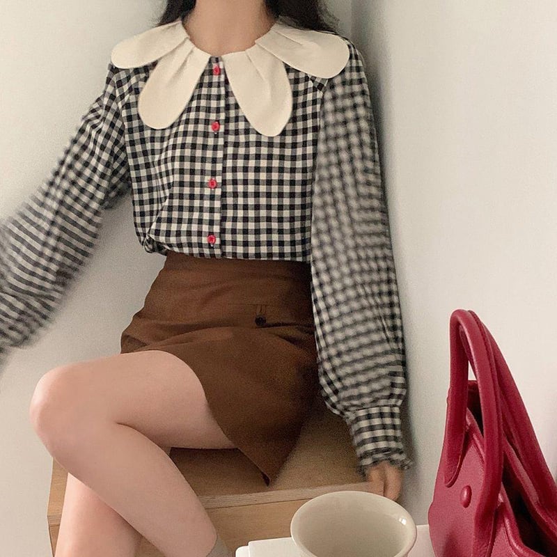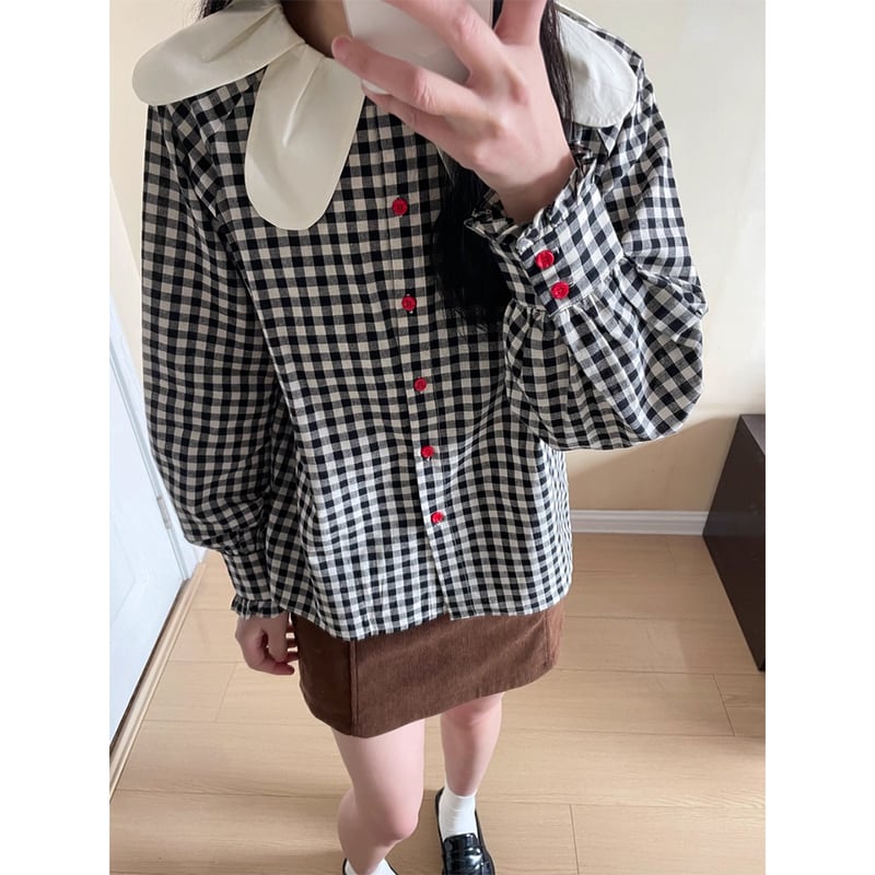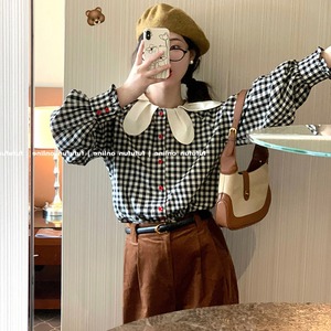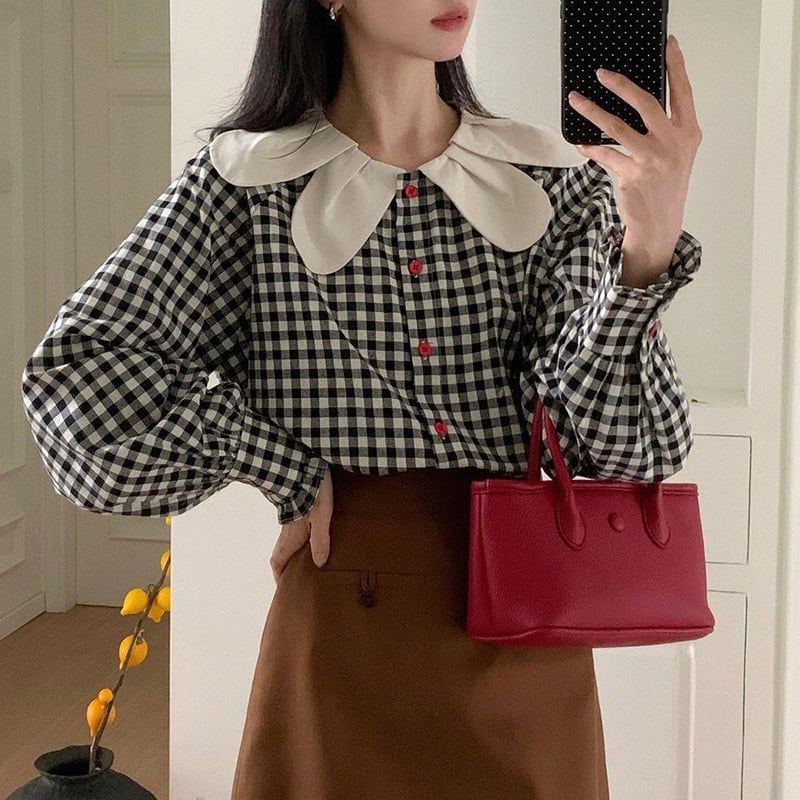 【BXHシリーズ】★シャツ★ トップス レディース 長袖シャツ チェック柄 可愛い襟 花型襟 合わせやすい
