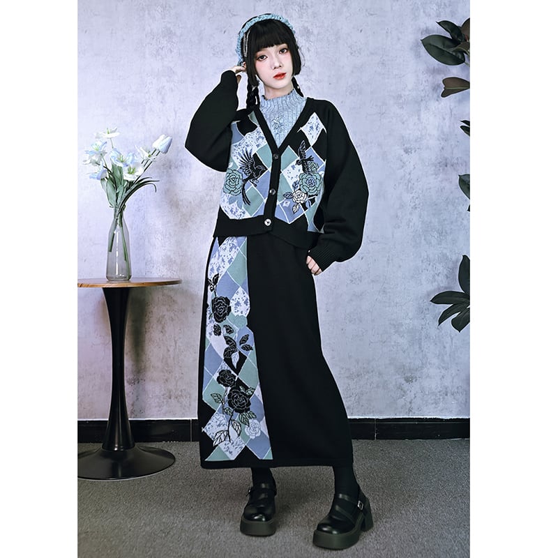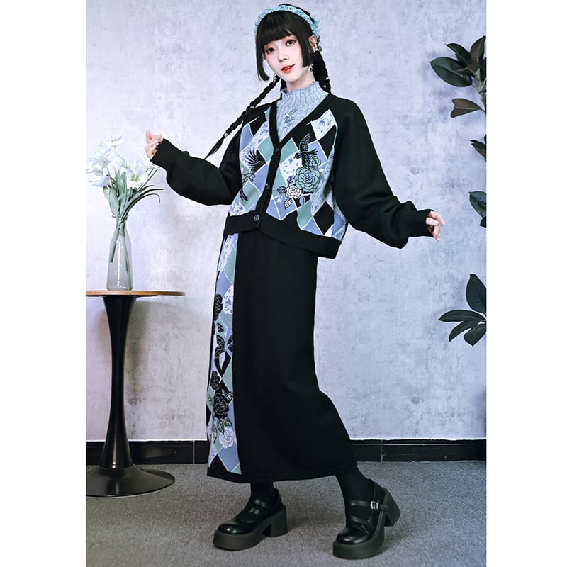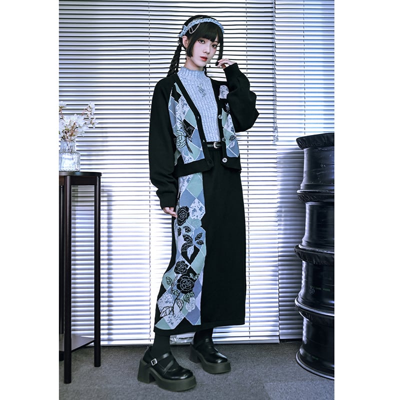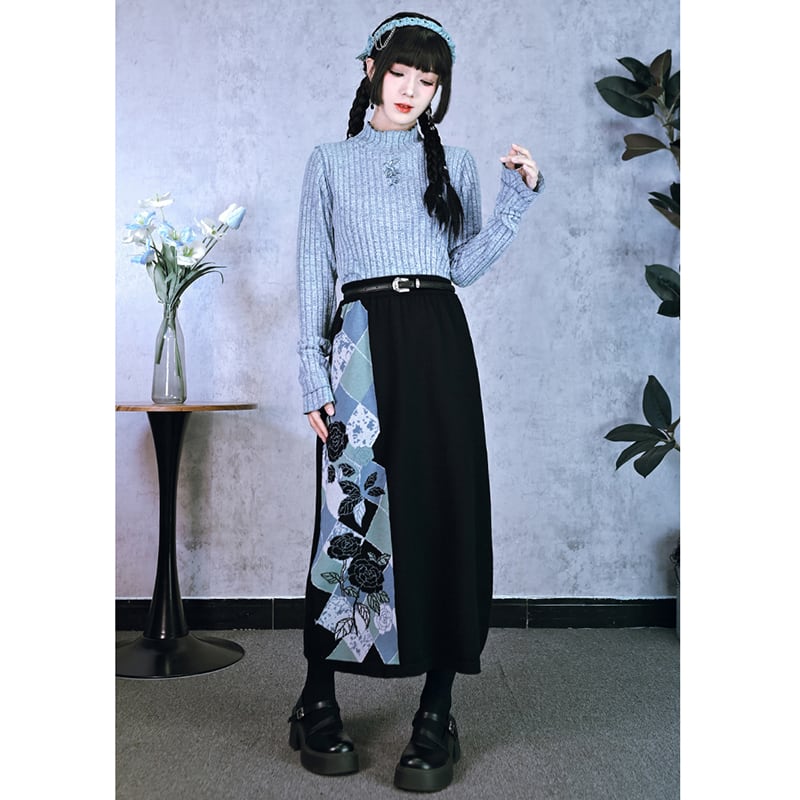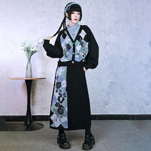 【古怪舍---鸞鳴赴夢シリーズ】★チャイナ風スカート★ ボトムス ニットスカート 花柄 配色 着痩せ