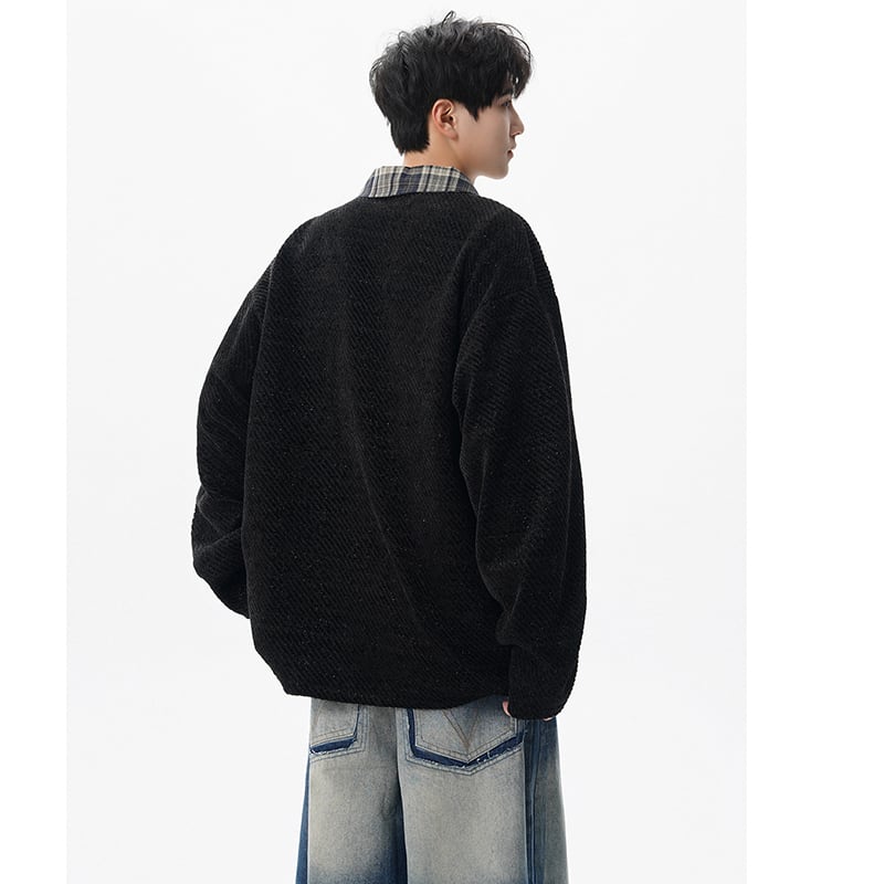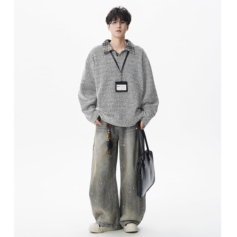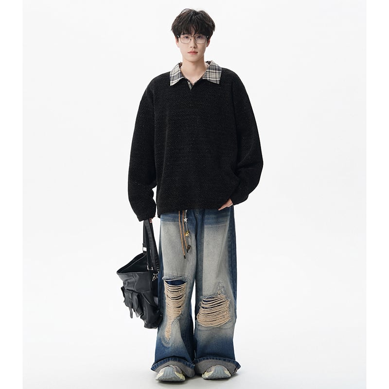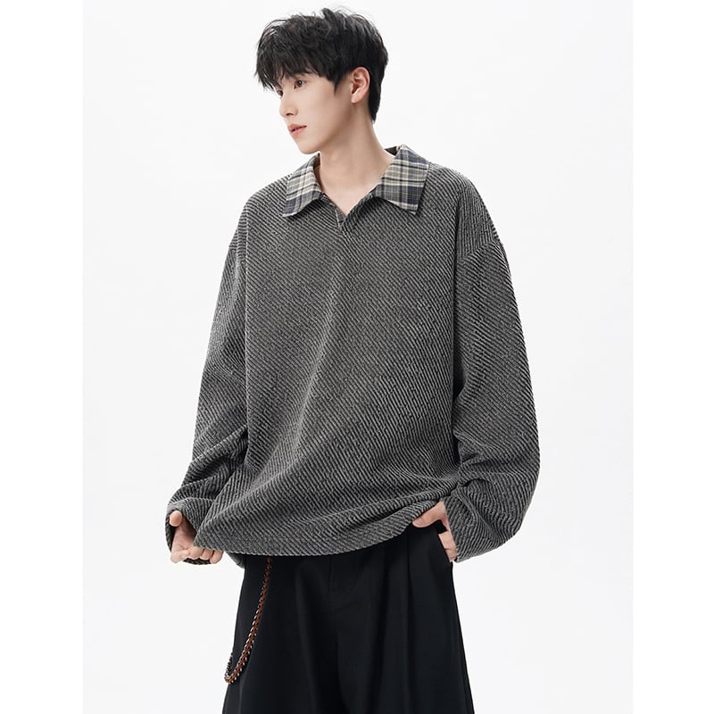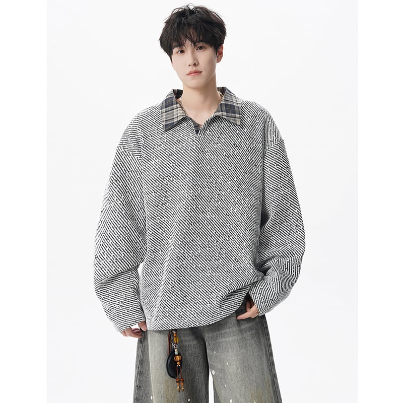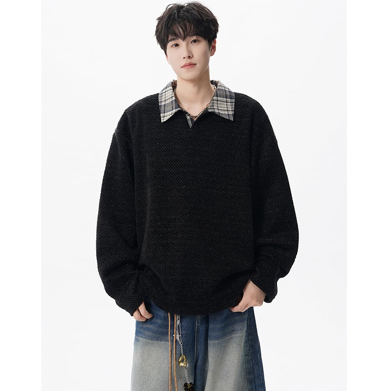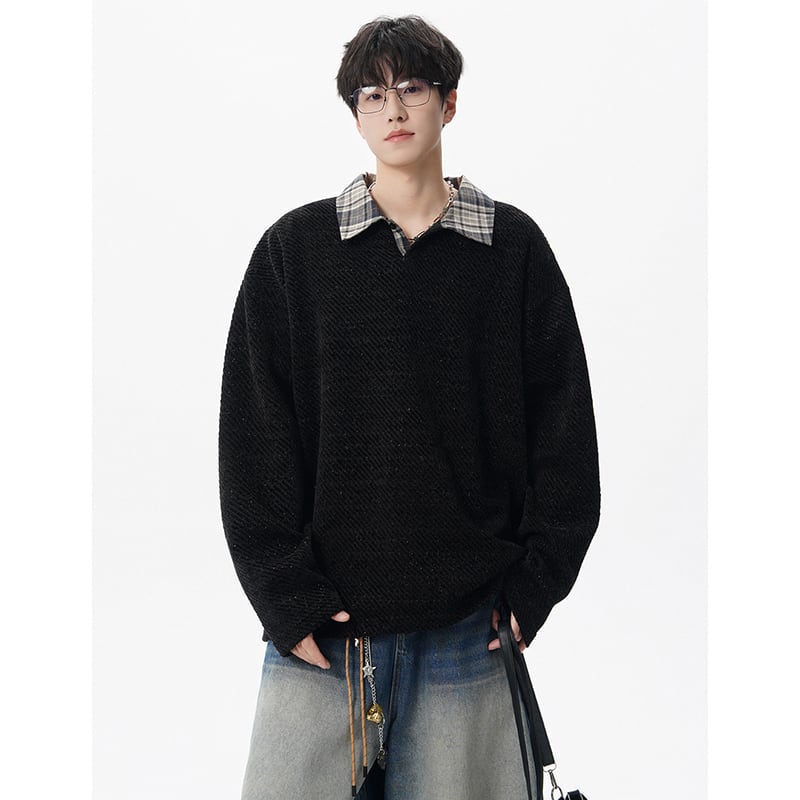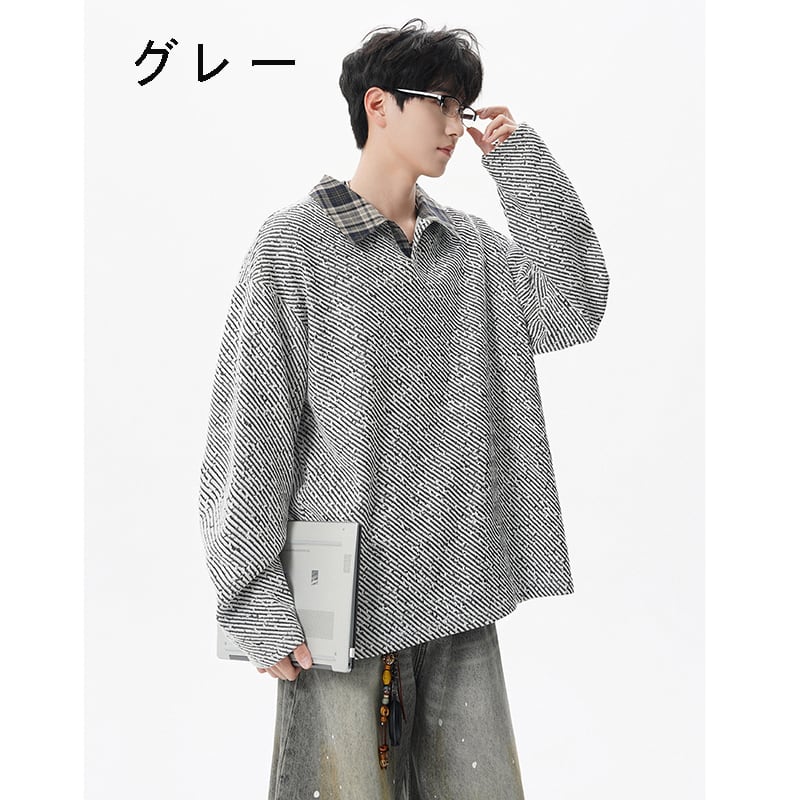 【V37シリーズ】★POLOシャツ★ 3color トップス 男女兼用 メンズ チェック柄 フェイクレイヤード 黒 灰