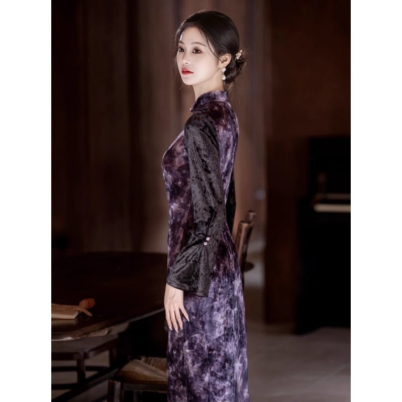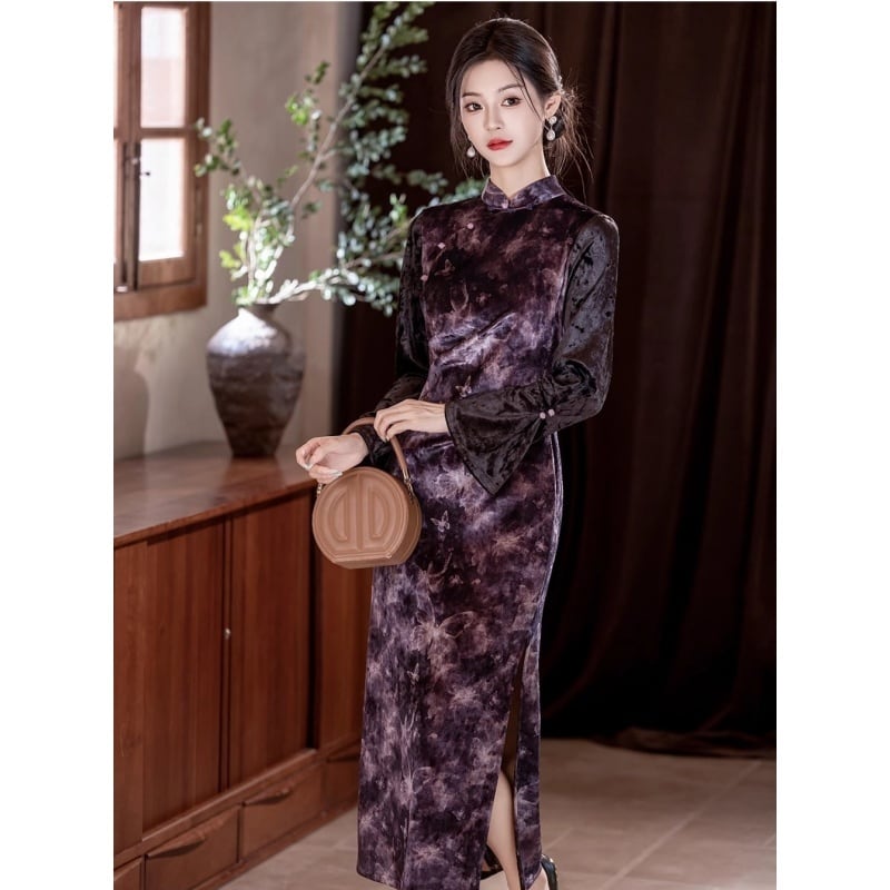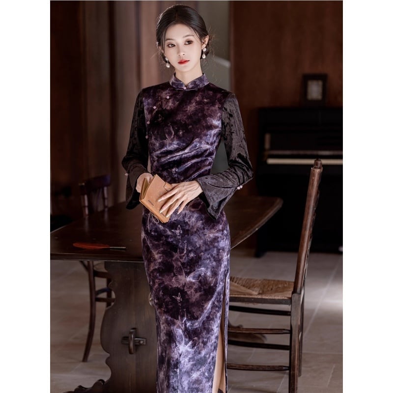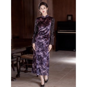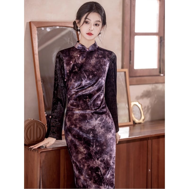 【紅舍シリーズ】★チャイナドレス★長袖 ベルベット 蝶々 チャイナ風ワンピース エレガント レディース レトロ