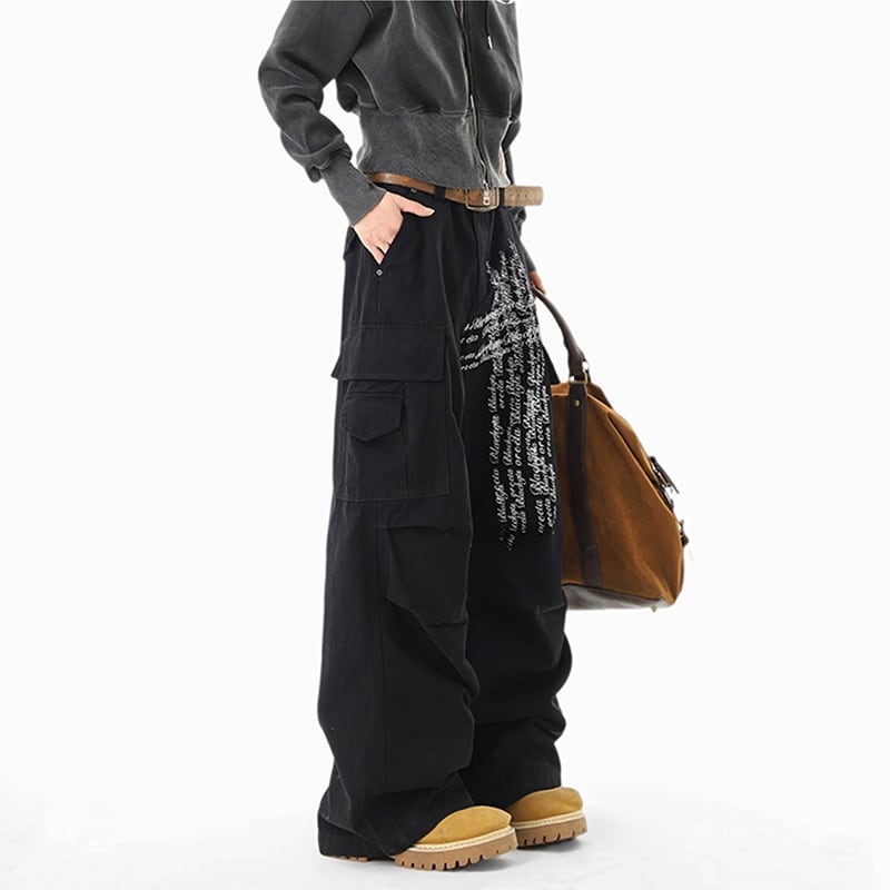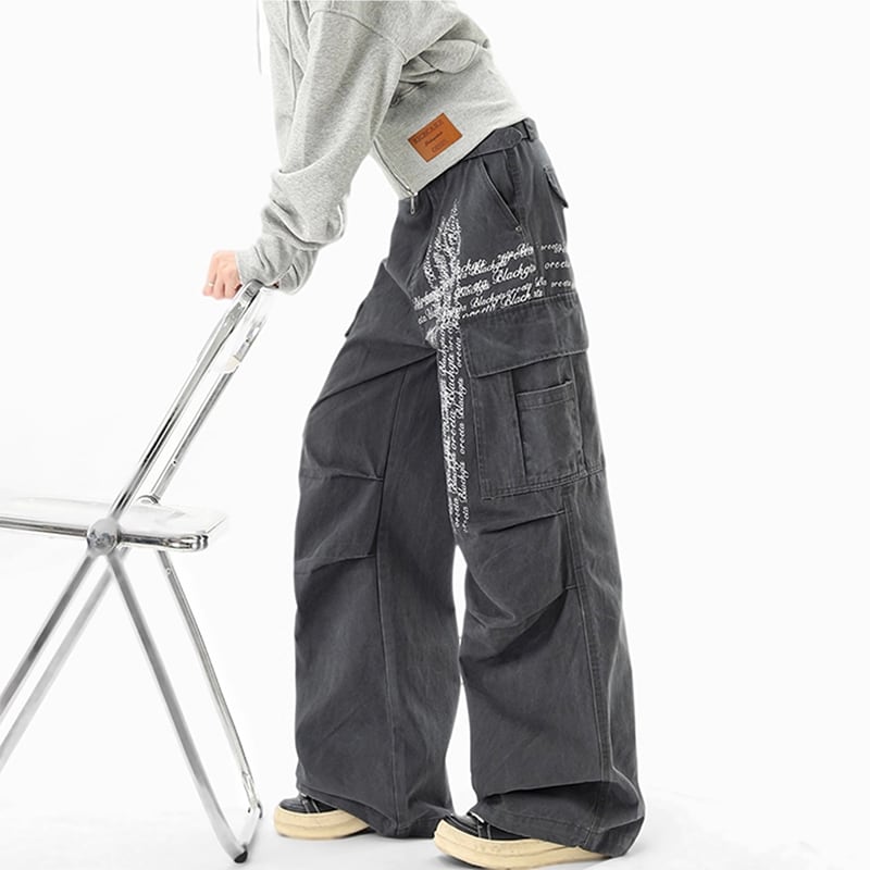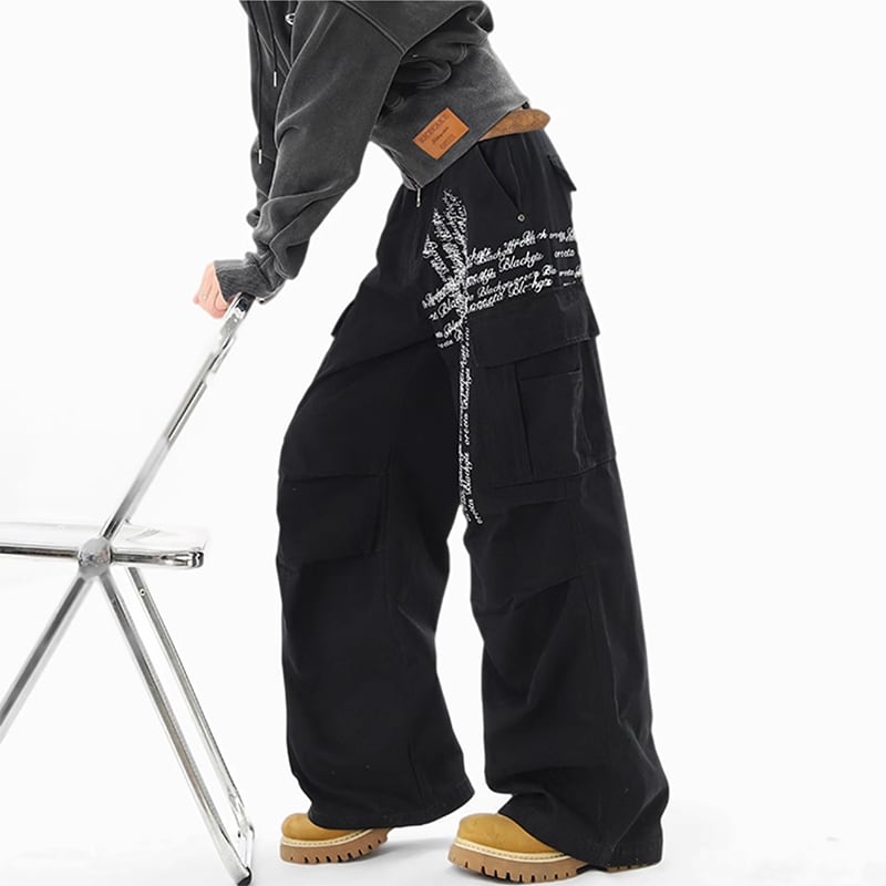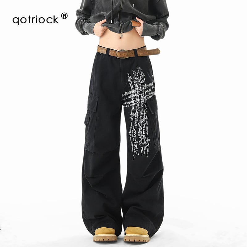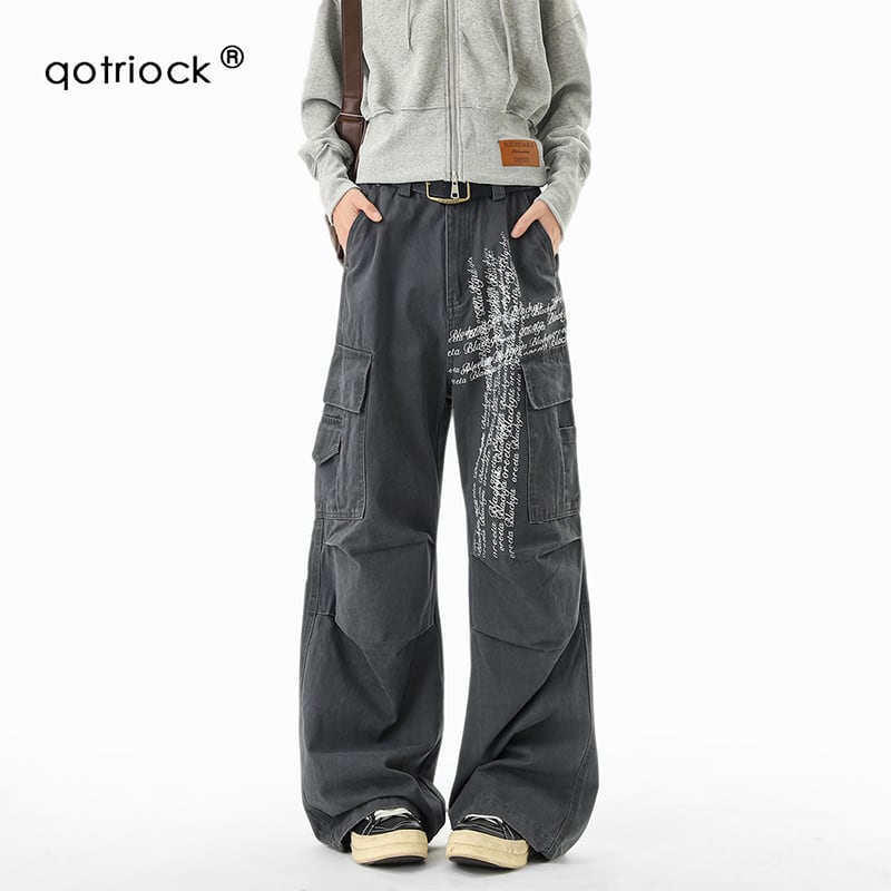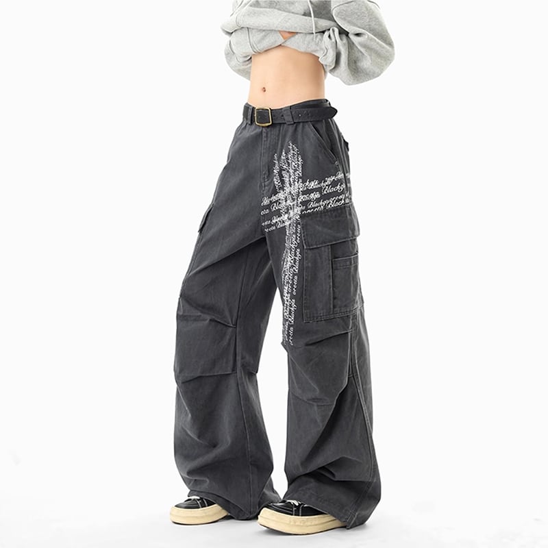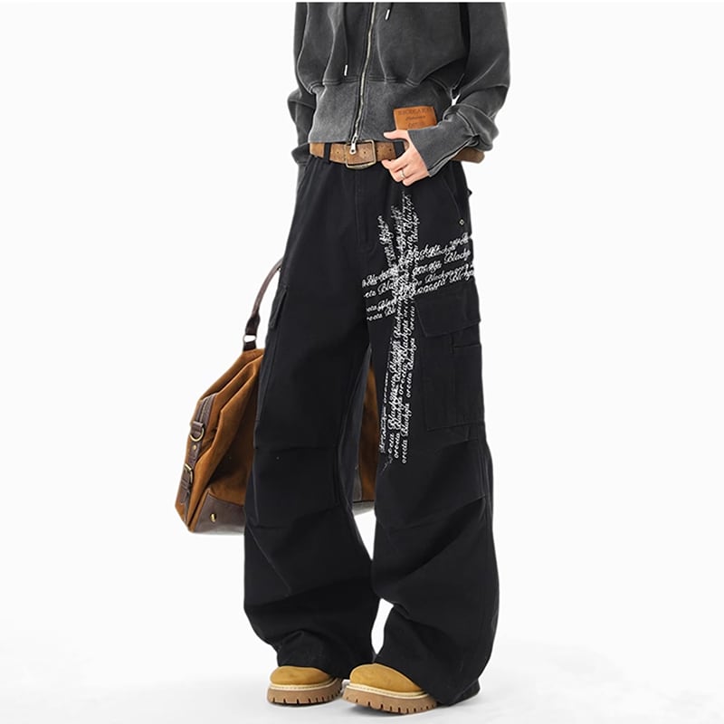 【Qotriockシリーズ】★カジュアルパンツ★ 2color ボトムス ズボン 男女兼用 メンズ 十字架 落書き かっこいい 黒 灰