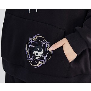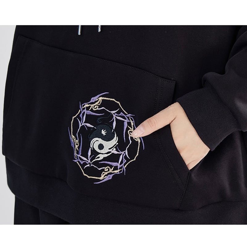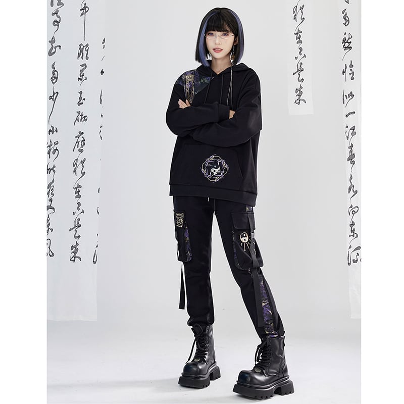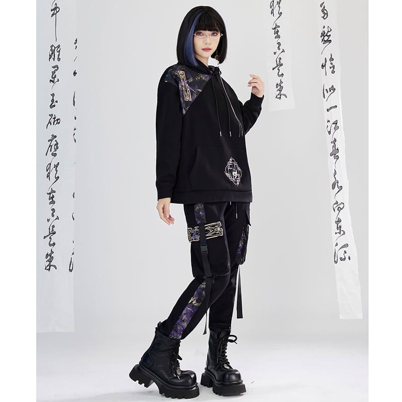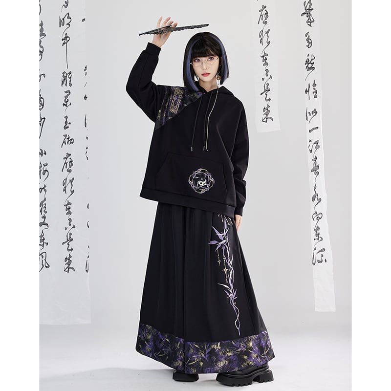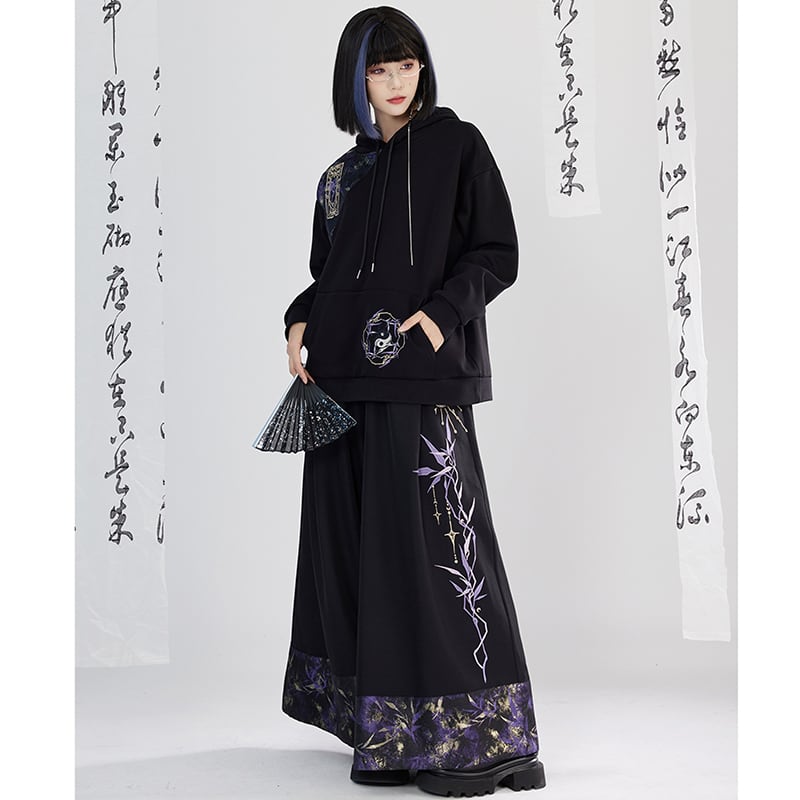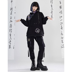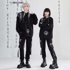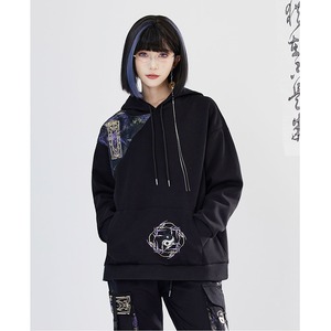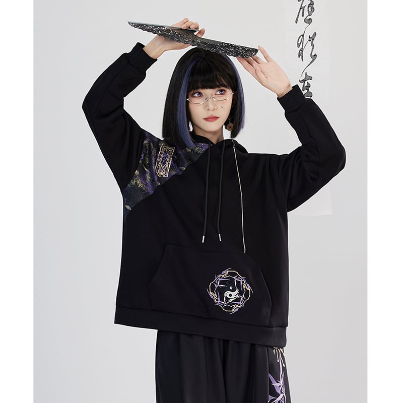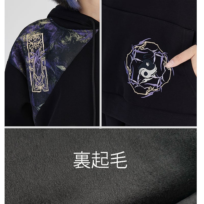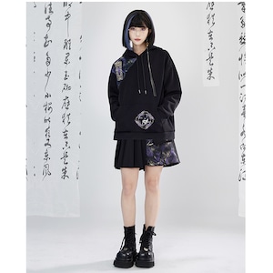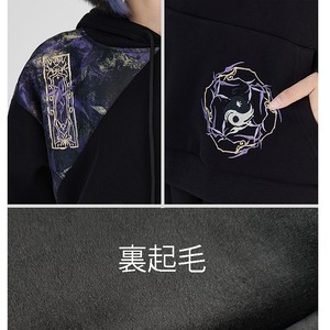 【卿棠---蒼竹問道シリーズ】★チャイナ風トップス★ 裏起毛 パーカー 男女兼用 メンズ 切り替え 黒 紫