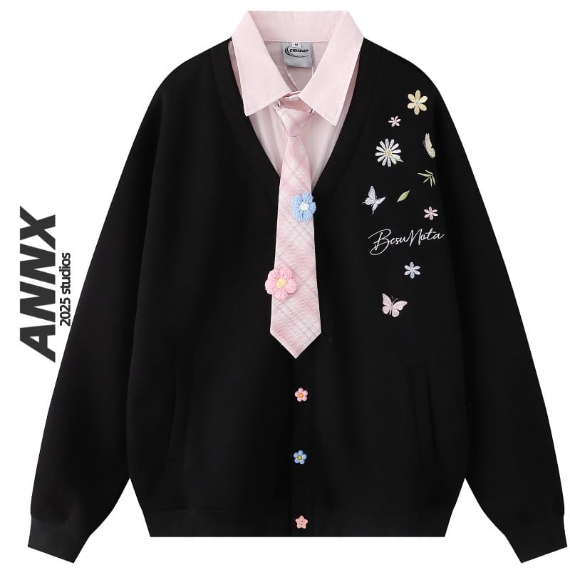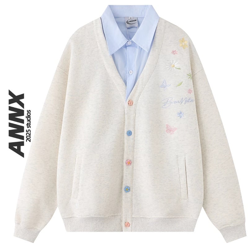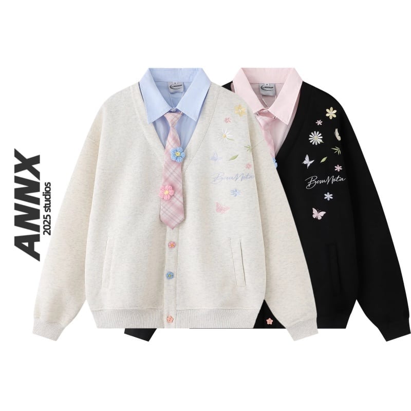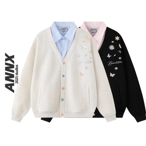 【ANNXシリーズ】★トップス★ 2color POLOネック フェイクレイヤード 男女兼用 レディース 花柄 刺繍 カジュアル