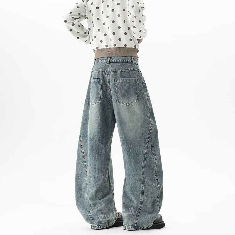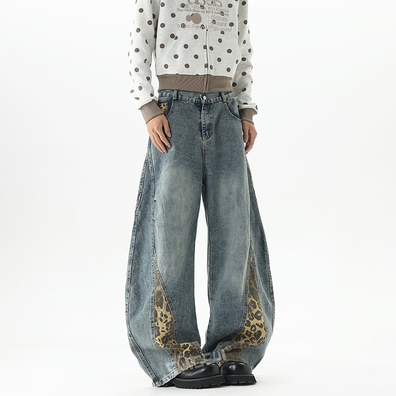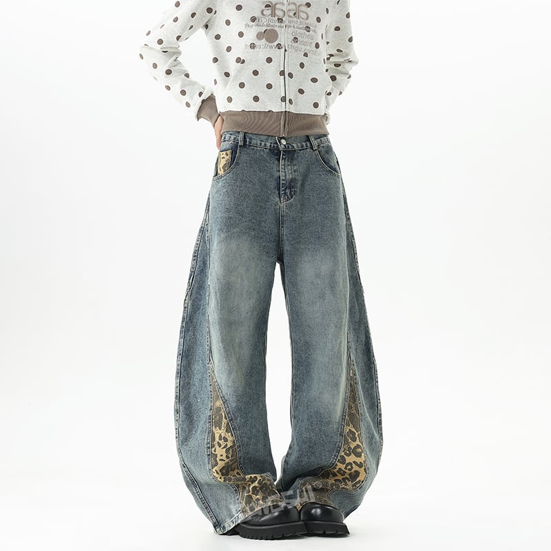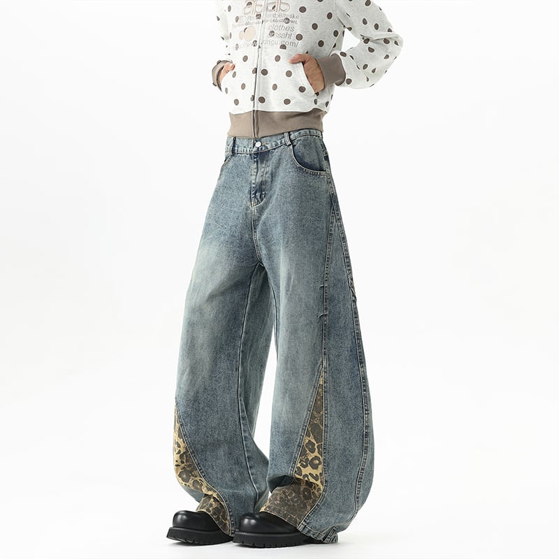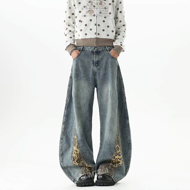 【SENSUシリーズ】★デニムパンツ★ ズボン ボトムス 男女兼用 メンズ 切り替え 豹柄 ブルー 青い