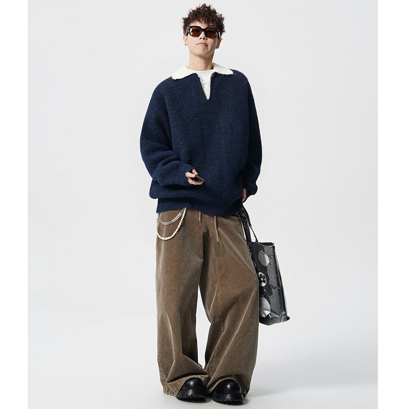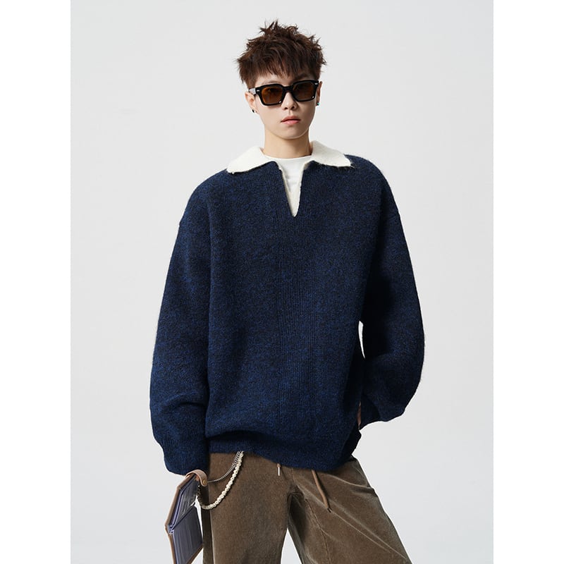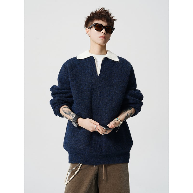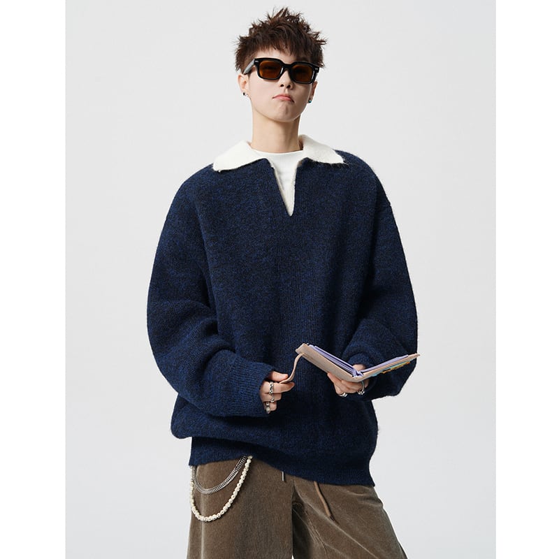 【GraceRubシリーズ】★セーター★ 2color POLOネック ニットトップス 男女兼用 メンズ 配色 青 灰 ネイビー グレー