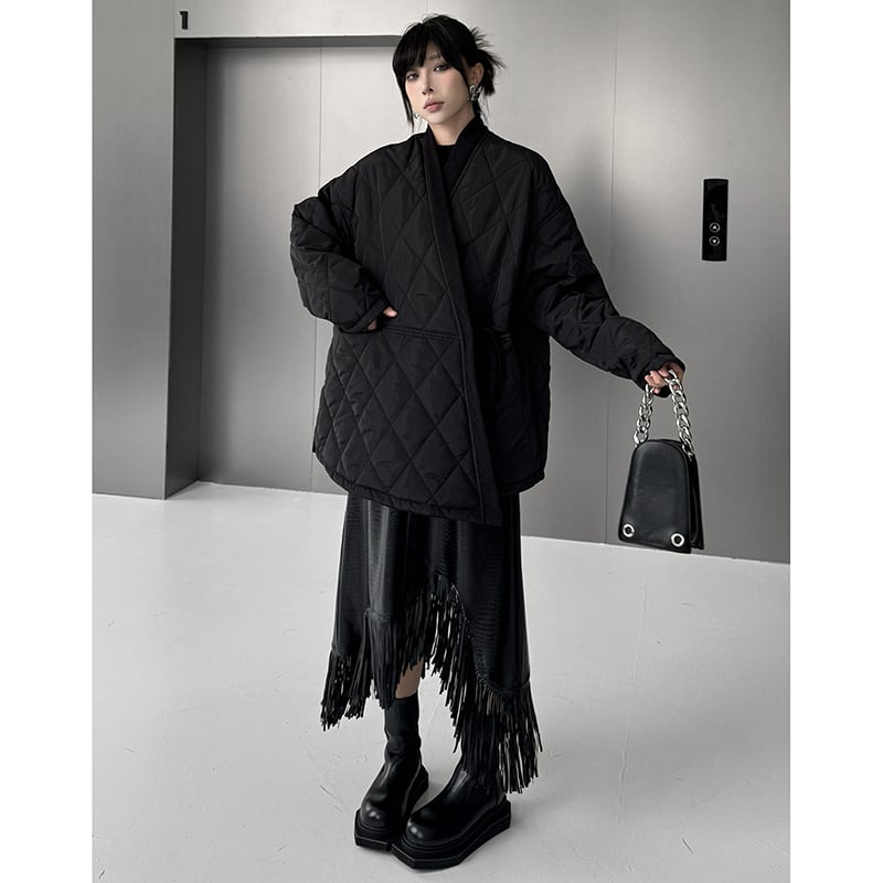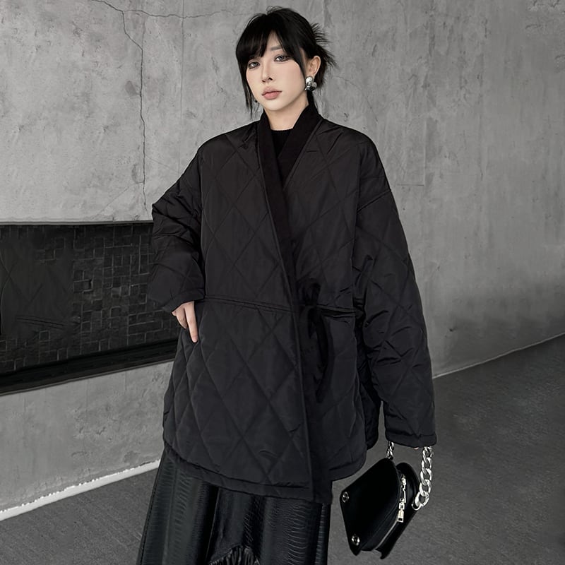 【YIDAOシリーズ】★チャイナ風コート★ アウター 綿入れ Vネック レディース ブラック 黒い 菱形