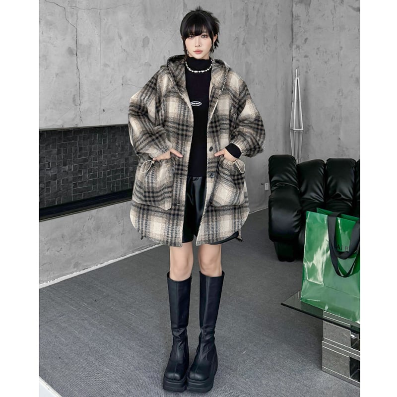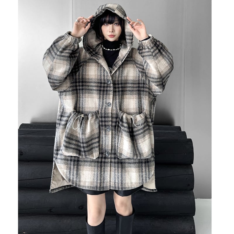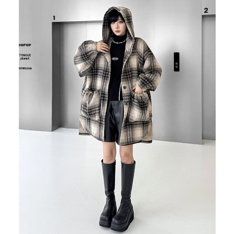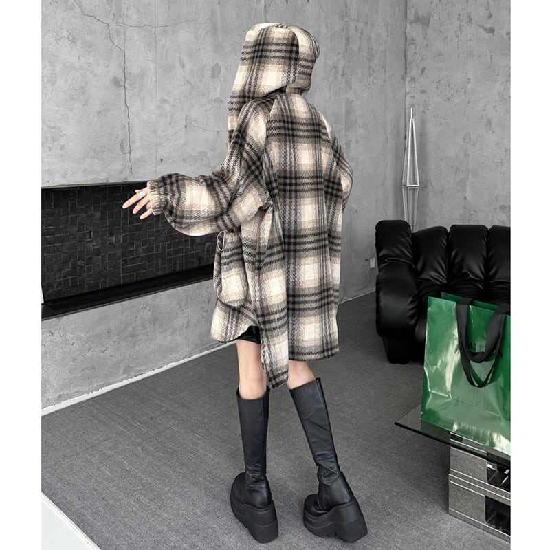 【YIDAOシリーズ】★コート★ アウター ラシャ 帽子付き チェック柄 ゆったり カーキブラウン 合わせやすい