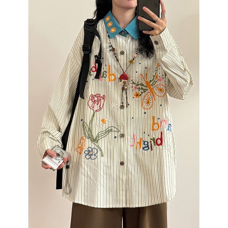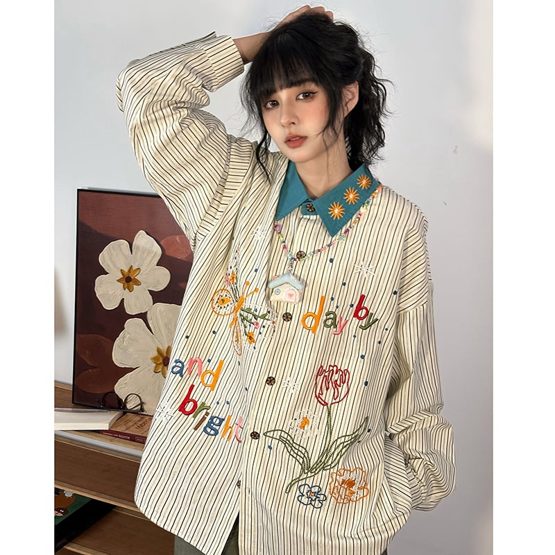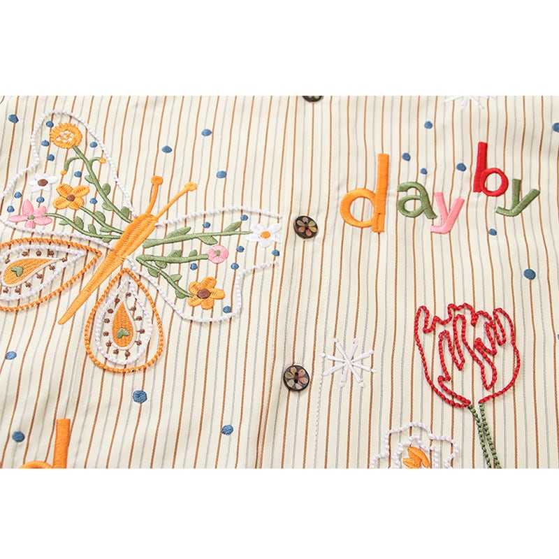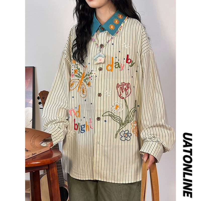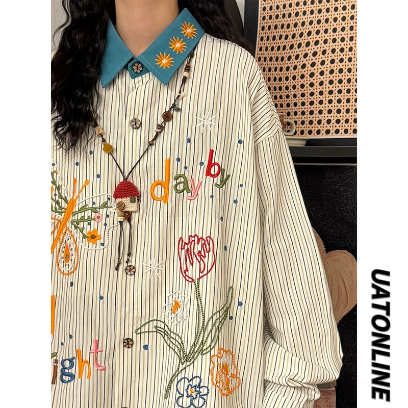 【UATONLINEシリーズ】★シャツ★ 2color 刺繍 トップス 長袖 男女兼用 メンズ 蝶々 花柄 縦縞 縞模様