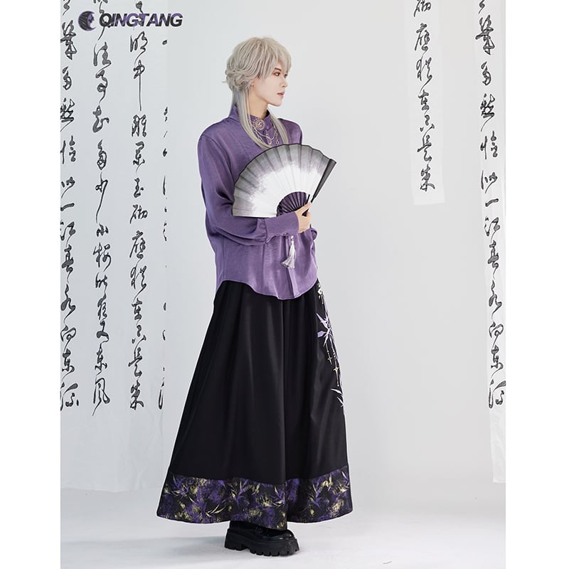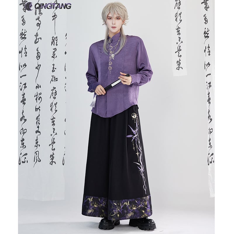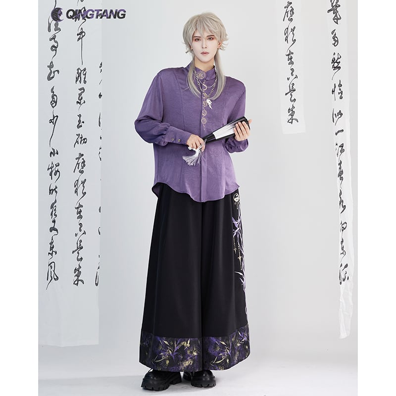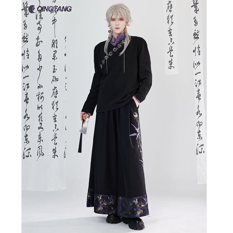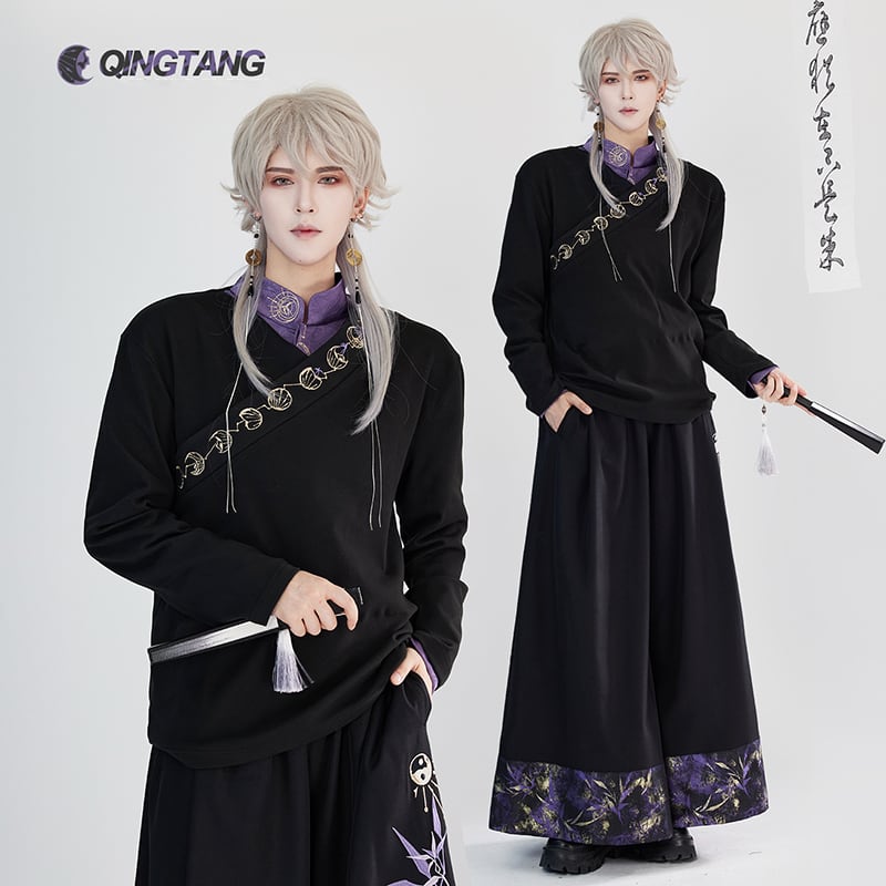 【卿棠---月相シリーズ】★チャイナ風トップス★ Vネック 刺繍 長袖 男女兼用 メンズ 漢服トップス ブラック 黒い