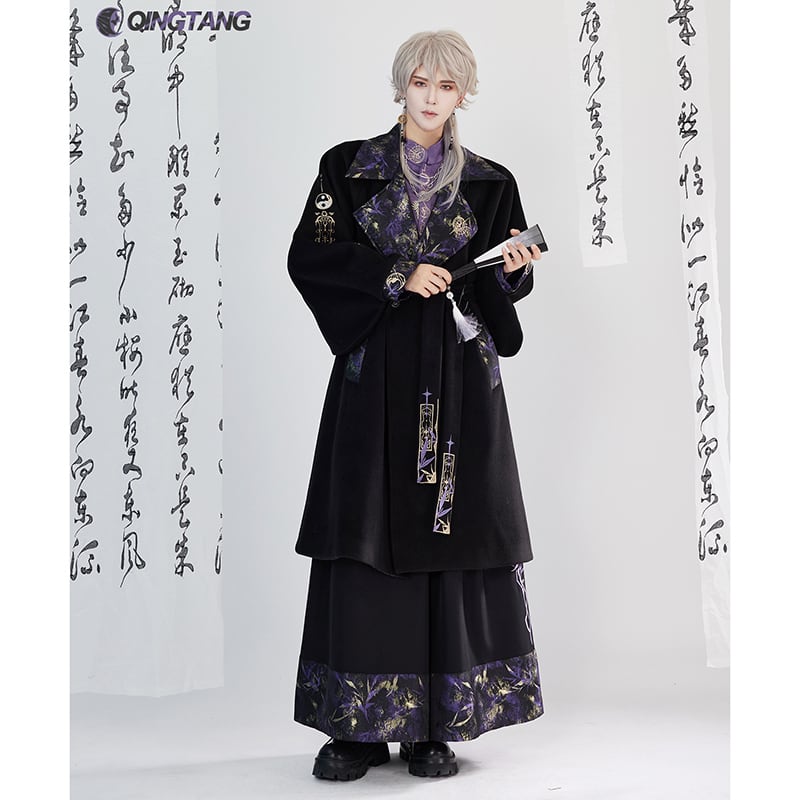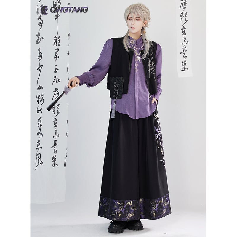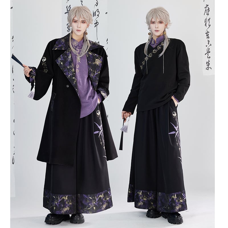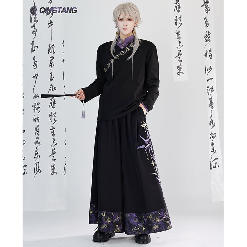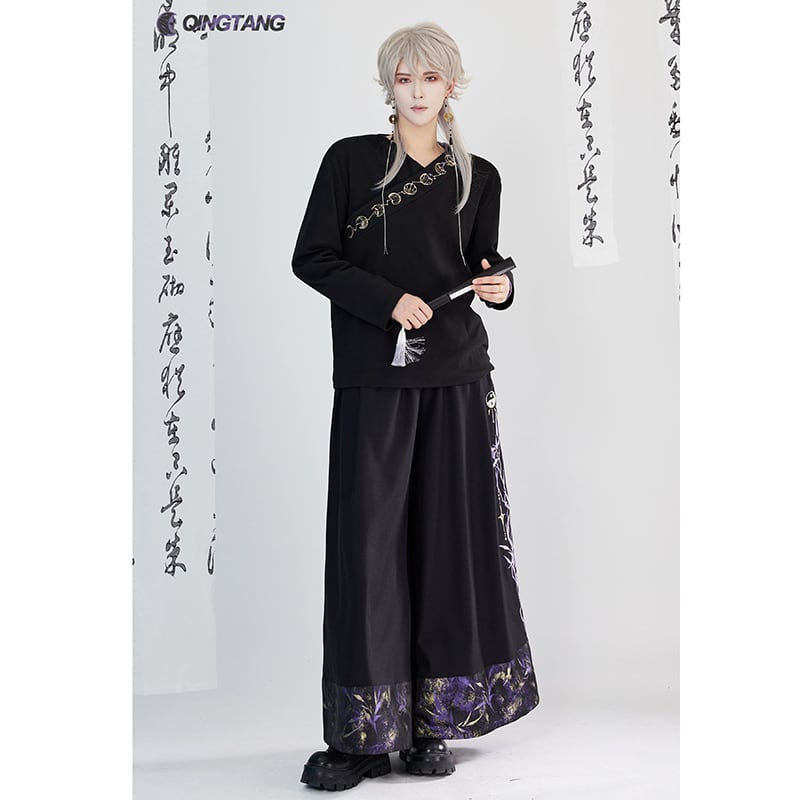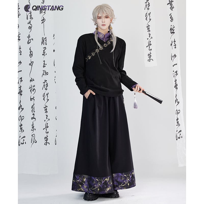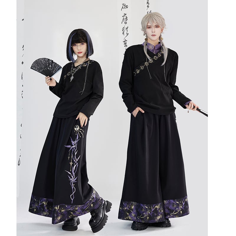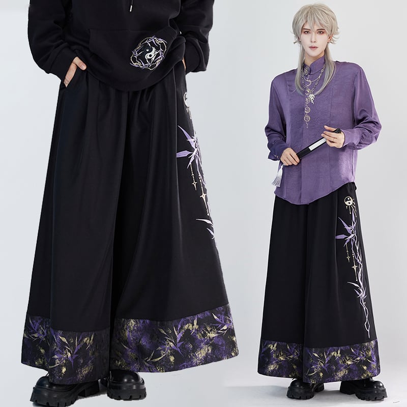 【卿棠---月相シリーズ】★チャイナ風ズボン★ ガウチョパンツ ボトムス 男女兼用 メンズ 黒 紫 切り替え