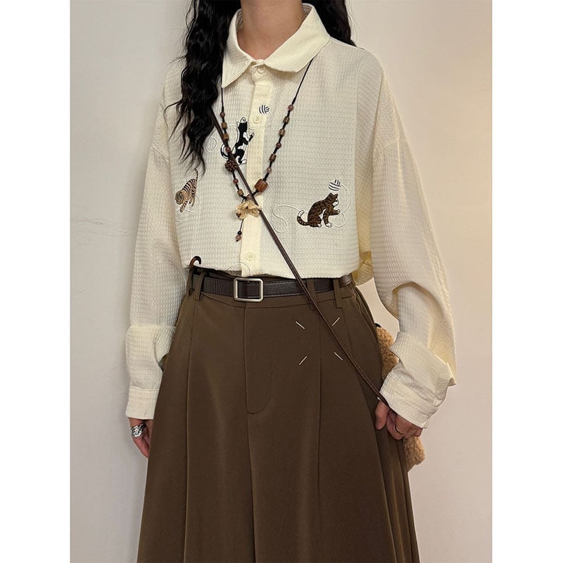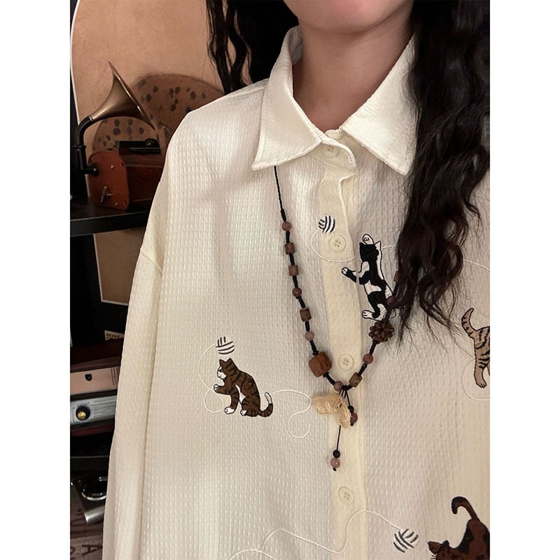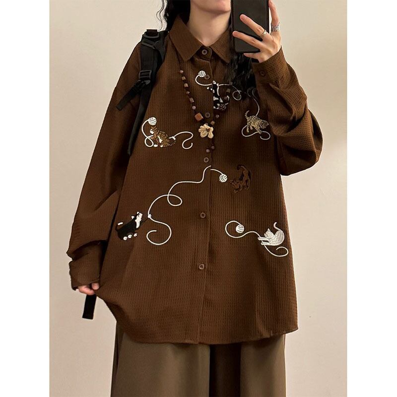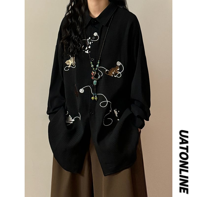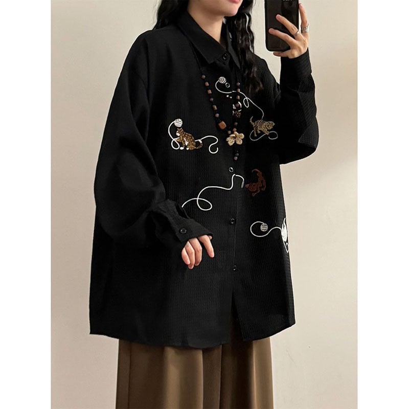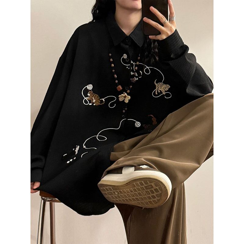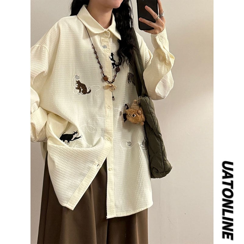 【UATONLINEシリーズ】★シャツ★ 3color 刺繍 トップス 長袖シャツ 男女兼用 メンズ 猫 ねこ ネコ
