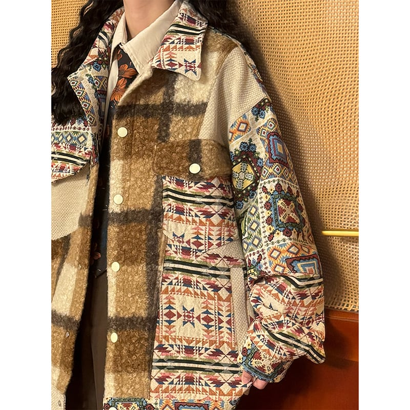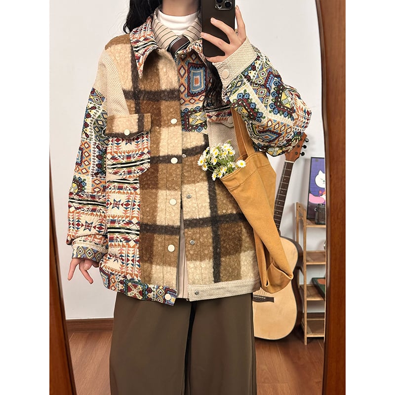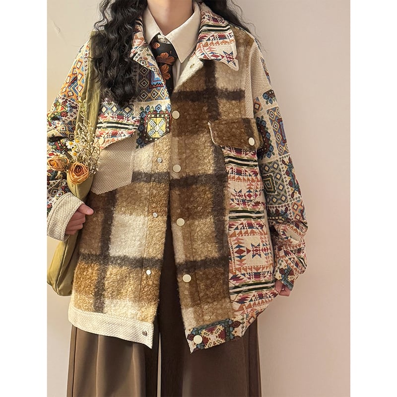 【UATONLINEシリーズ】★ジャケット★ アウター エスニック風 切り替え 男女兼用 メンズ 暖か チェック柄