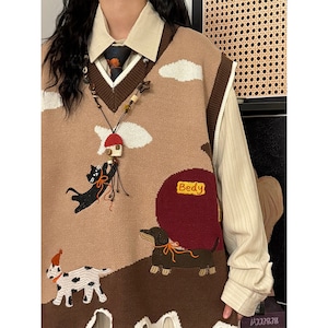 【UATONLINEシリーズ】★ニットベスト★ 2color トップス ベスト ノースリーブ 男女兼用 メンズ 猫 犬 動物 ねこ ネコ カートゥーン